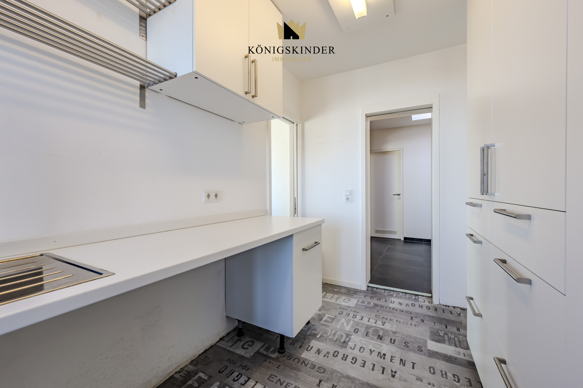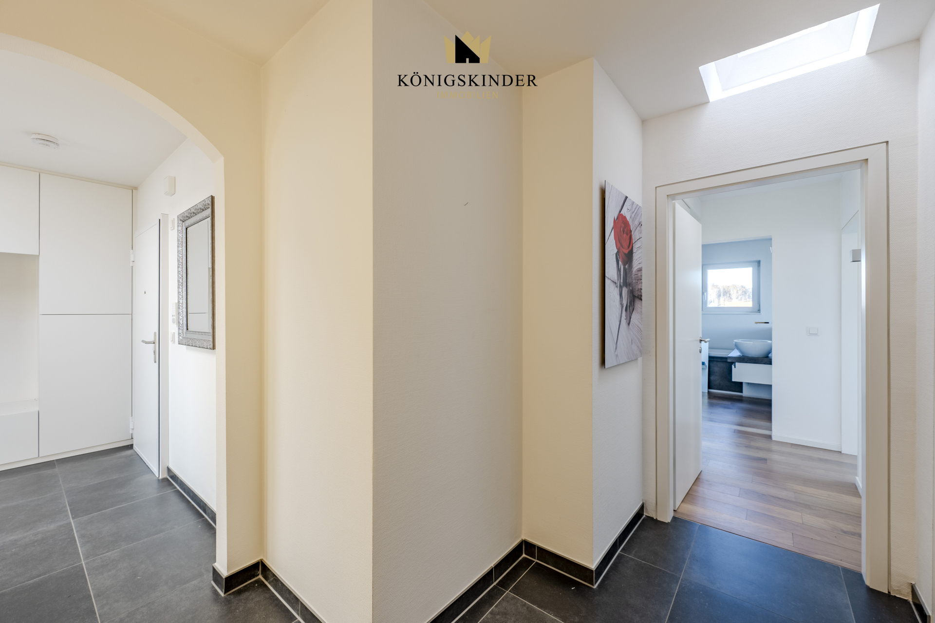 Betritt man die Wohnung, empfängt ein großzügiger Eingangsbereich mit Oberlicht-Fenster und eingebauten Garderoben- und Schrank-Elementen. Von hier gelangt man direkt in den großen und offen gestalteten Wohn- und Essbereich mit bodentiefen Fensterelementen zur Terrasse hin. Eine moderne und sehr hochwertige, offene Küche ist Bestandteil der ausgesprochen gelungenen Architektur. Hinter der offenen Küche ist ein Hauswirtschaftsraum angeordnet.