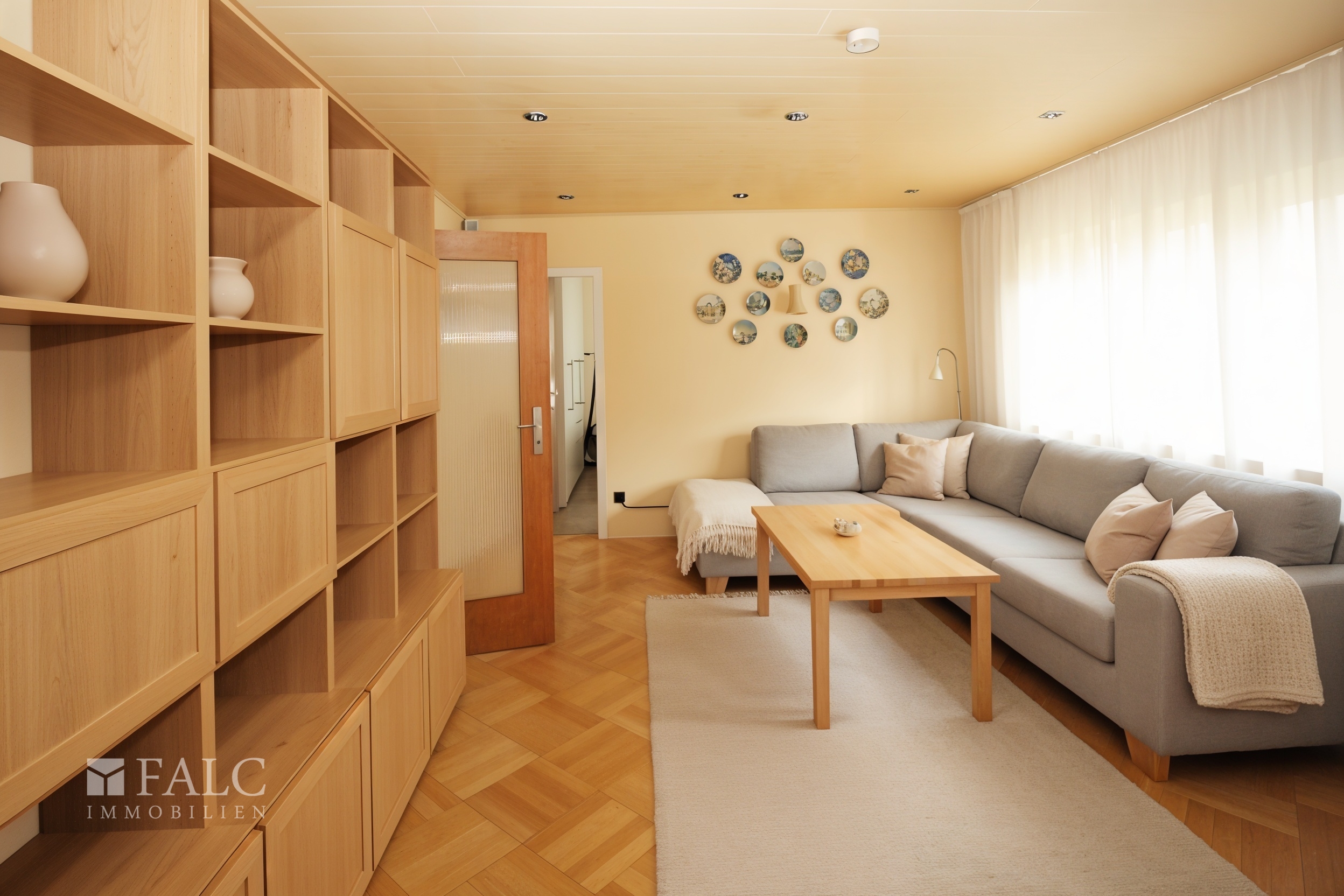 Wohnzimmer: Parkettboden, Holzdecke hell mit Einbaudownlights,