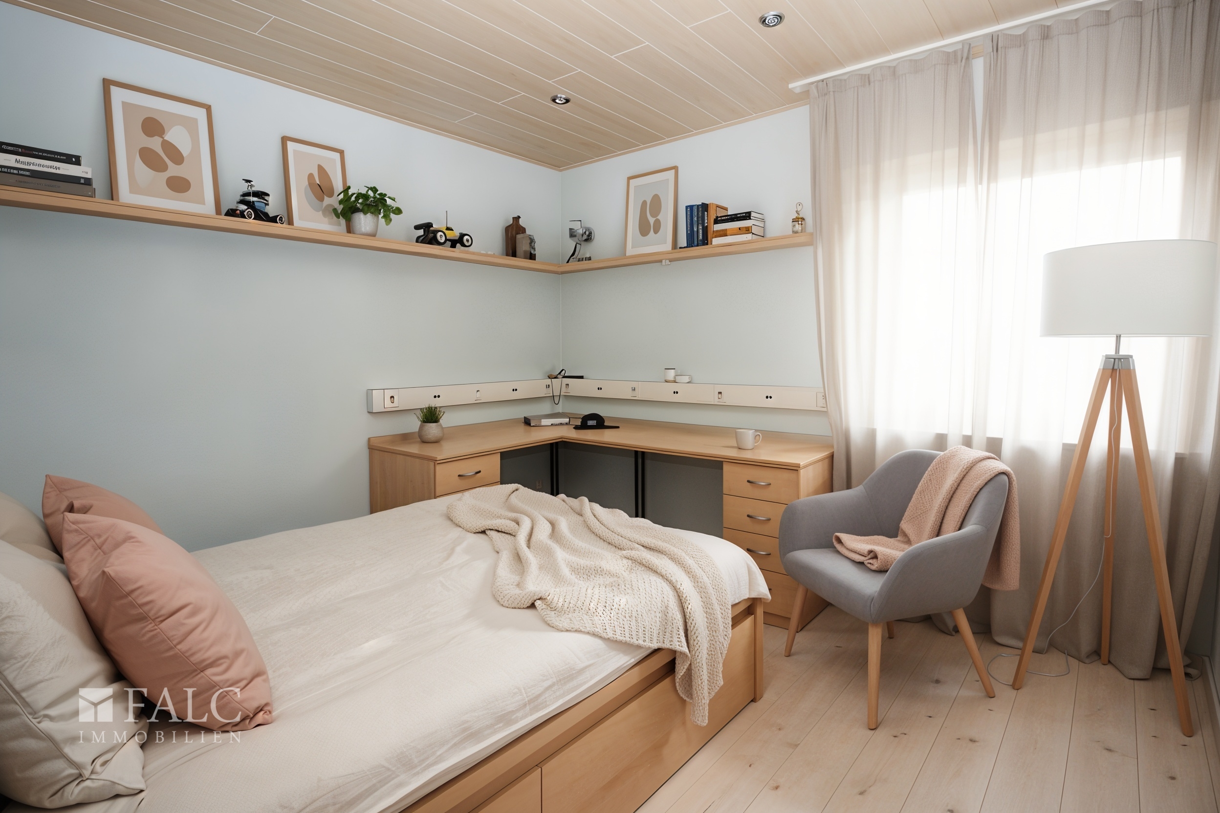 Schlafzimmer: Holzboden helle Eiche Optik, Einbaudownlights.