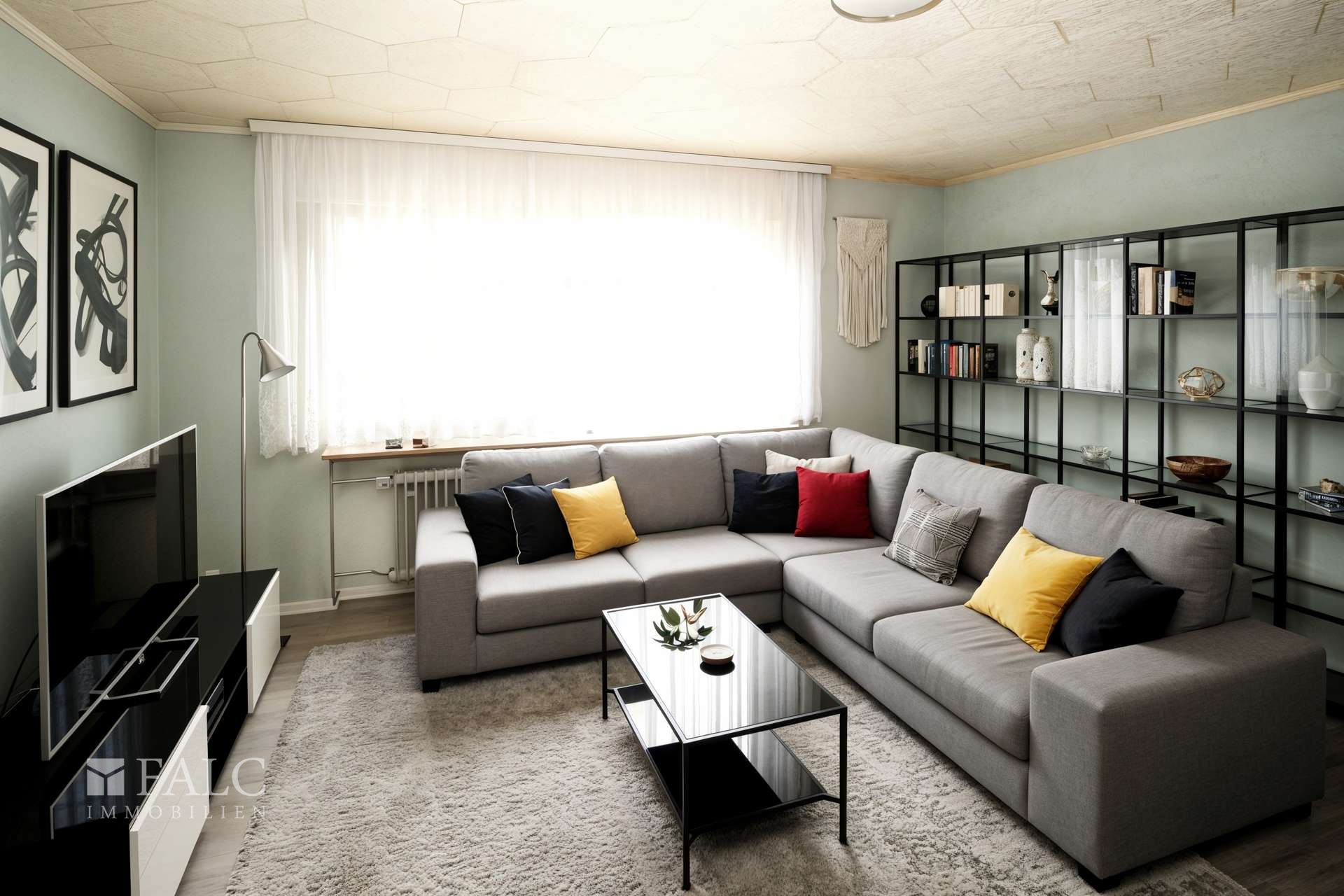 Wohnzimmer: Boden mit Teppich, Deckenplatten weiß, Wände mit Tapete.