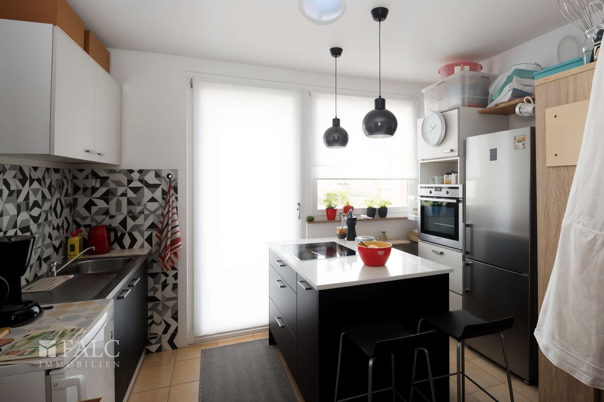 Marmorfliesenspiegel im Bereich des Spülbeckens und Herd, Decke weiß gestrichen mit Einbaudownlights.