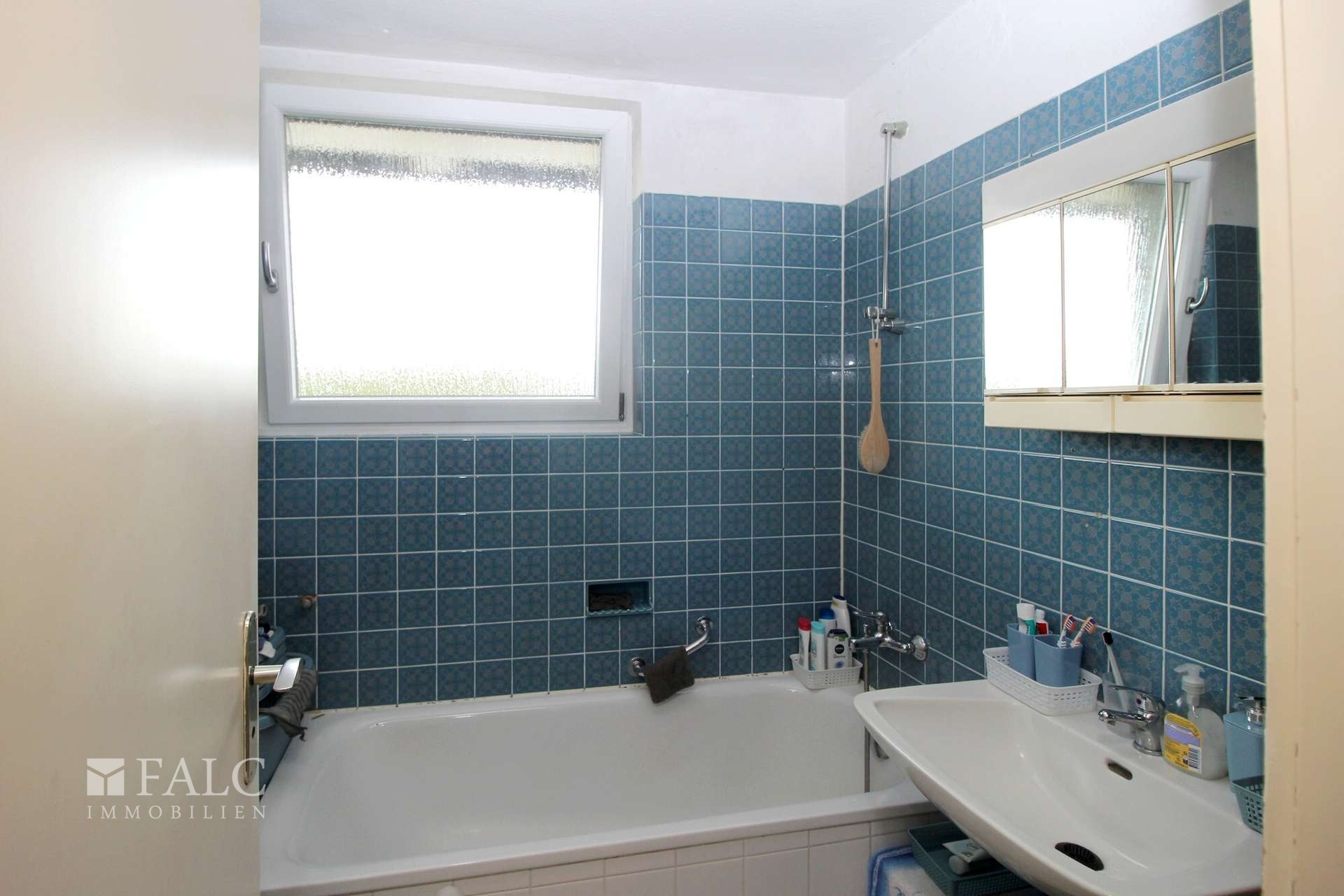 Bad: Raum bis ca. 30 cm unter der Decke gefliest, 1 Waschbecken, Badewanne mit integrierter Dusche, Fenster Kunststoff weiß.
