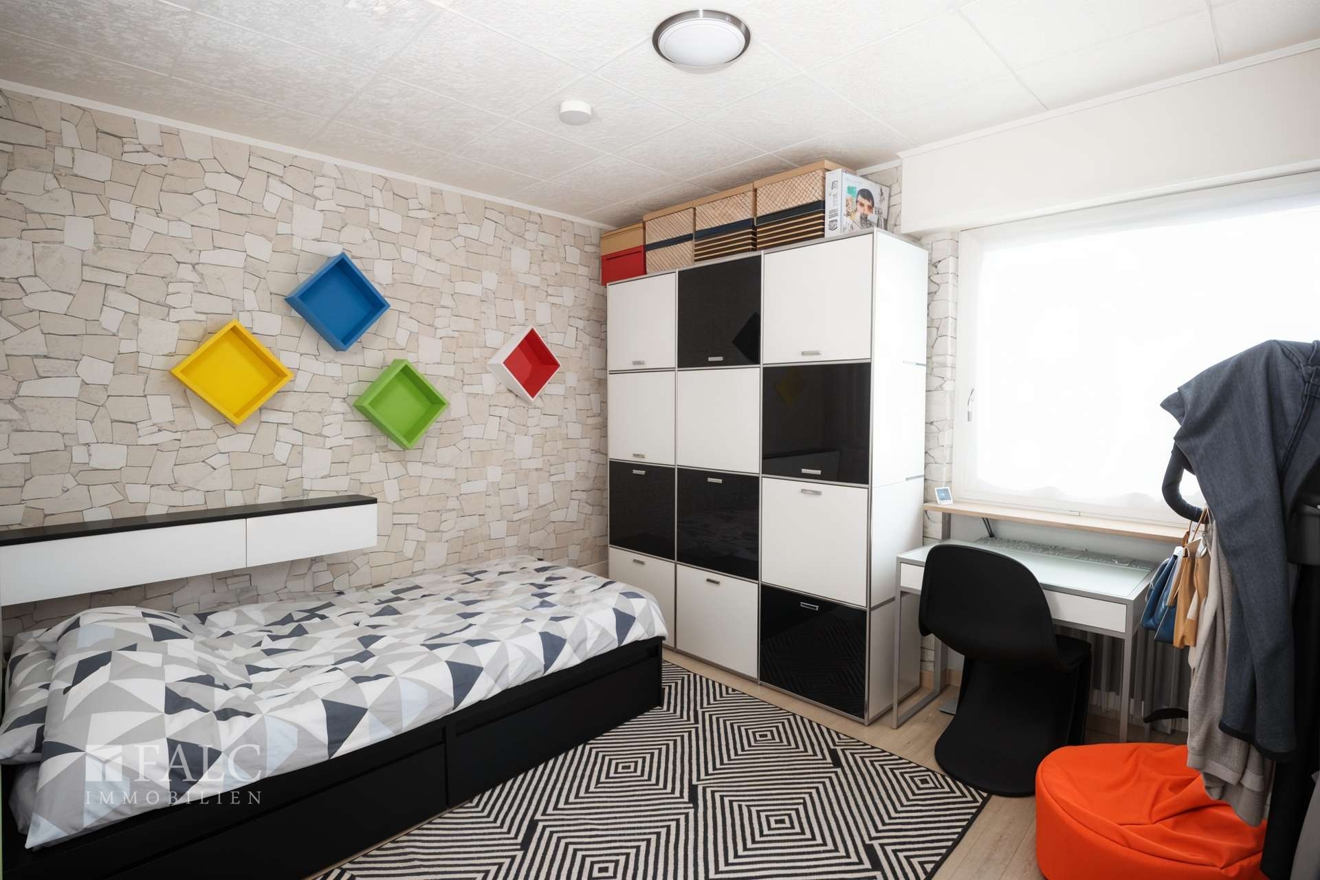 Kinderzimmer: Boden mit Teppich, Deckenplatten weiß, Wände mit Tapete, Zugang zum Balkon -