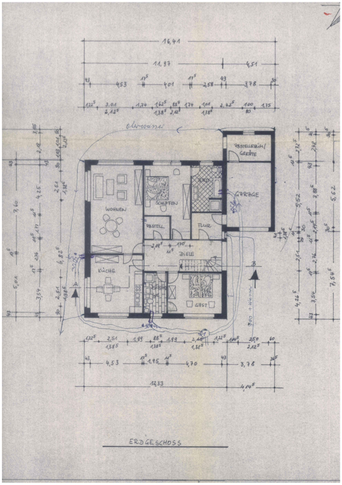 Flur: ca. 18,32 qm Büro: ca. 16,53 qm Duschbad: ca. 6,75 qm Küche: ca. 22,52 qm Wohnzimmer: ca. 34,36 qm Abstellraum: 2,80 qm Schlafzimmer: ca. 21,30 qm Bad: ca. 9.80 qm Hauswirtschaftsraum: ca. 5,56 qm