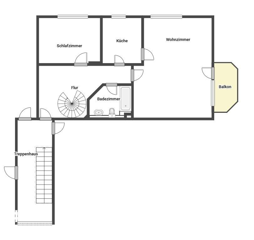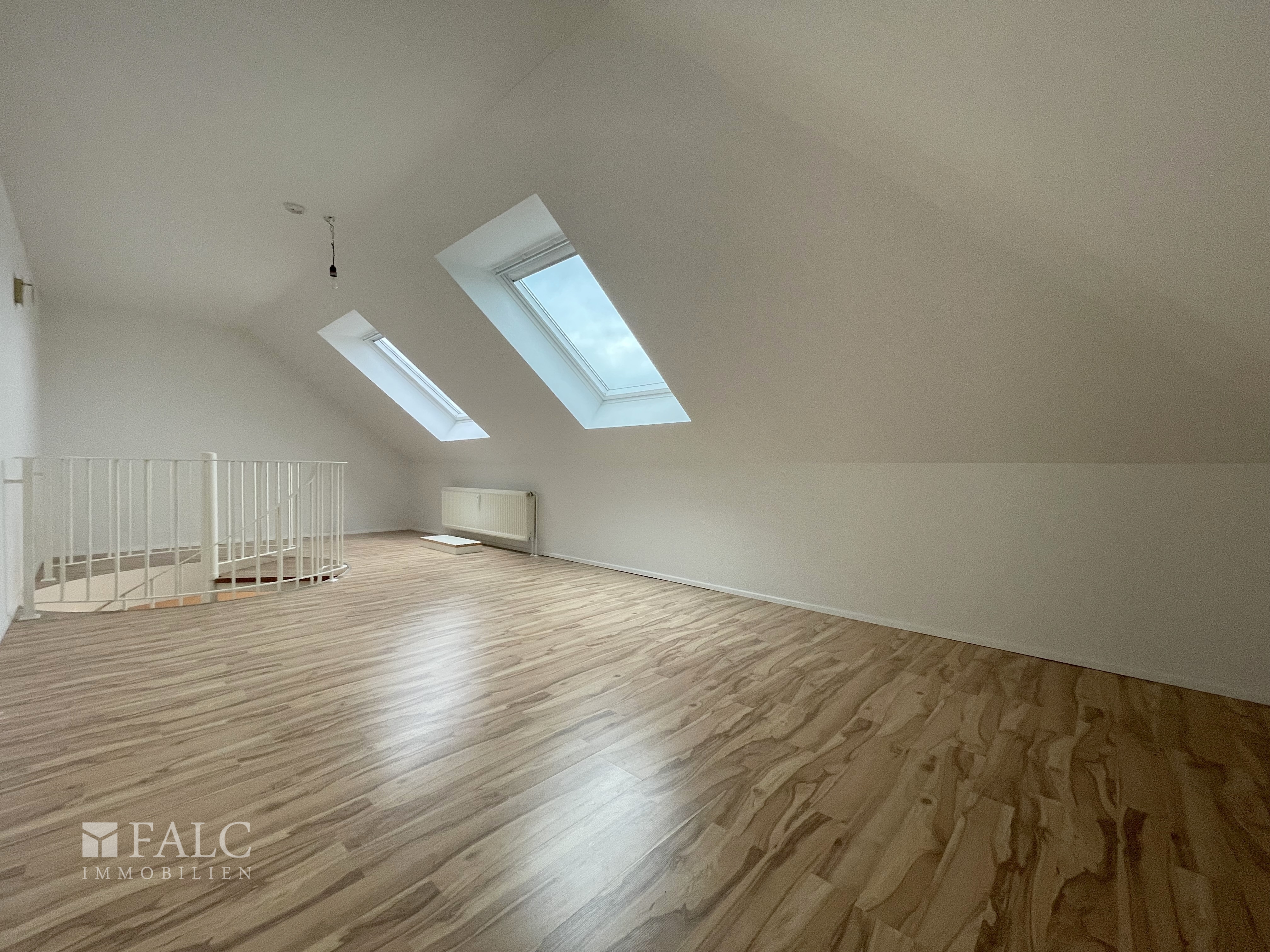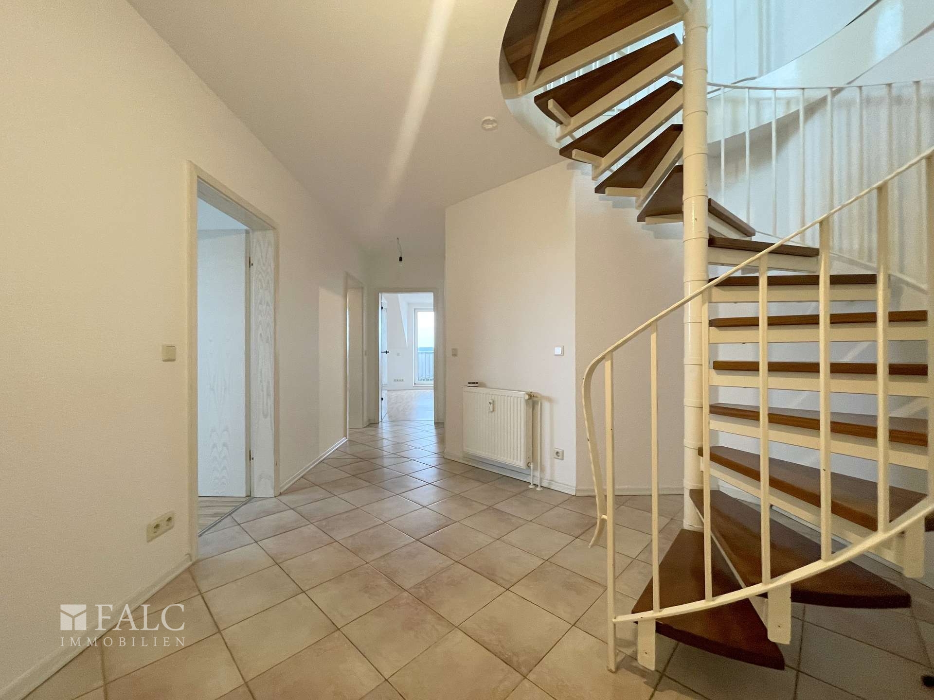 Das Badezimmer ist modern ausgestattet und verfügt über eine Badewanne. Über eine Wendeltreppe im Wohnbereich gelangt man in die obere Ebene der Wohnung, die sich ideal als Büro oder Rückzugsraum nutzen lässt.