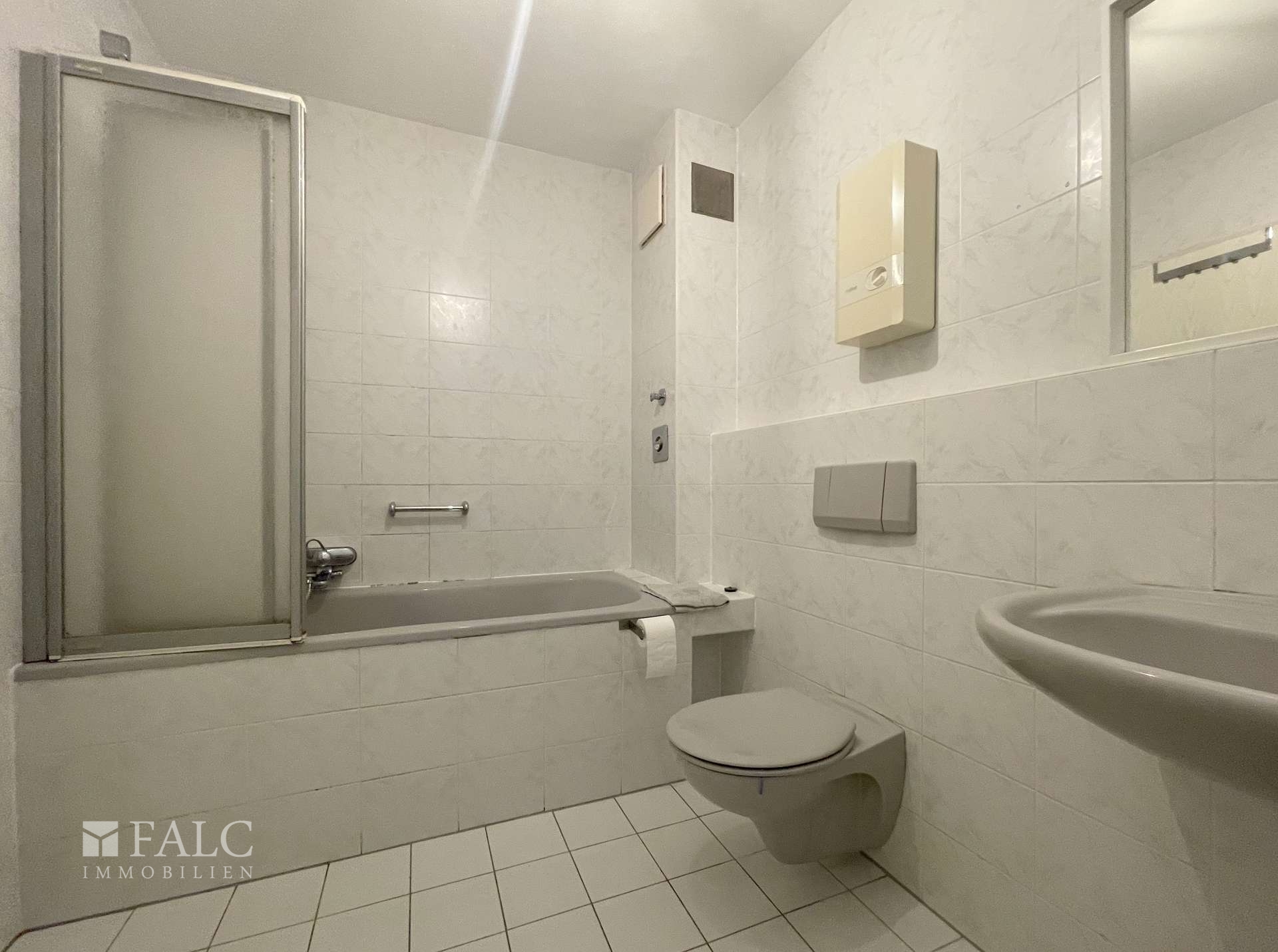 Die Bodenbeläge in der Wohnung wurden mit hochwertigen Materialien versehen: Die Küche, der Flur und das Bad sind mit modernen Fliesen ausgestattet, wobei die Wände im Badezimmer bis zur Decke gefliest wurden, was für eine pflegeleichte Gestaltung sorgt. Der Bodenbelag im Büro, Wohnzimmer und Schlafzimmer besteht aus strapazierfähigem Laminat, das eine warme und einladende Atmosphäre schafft.