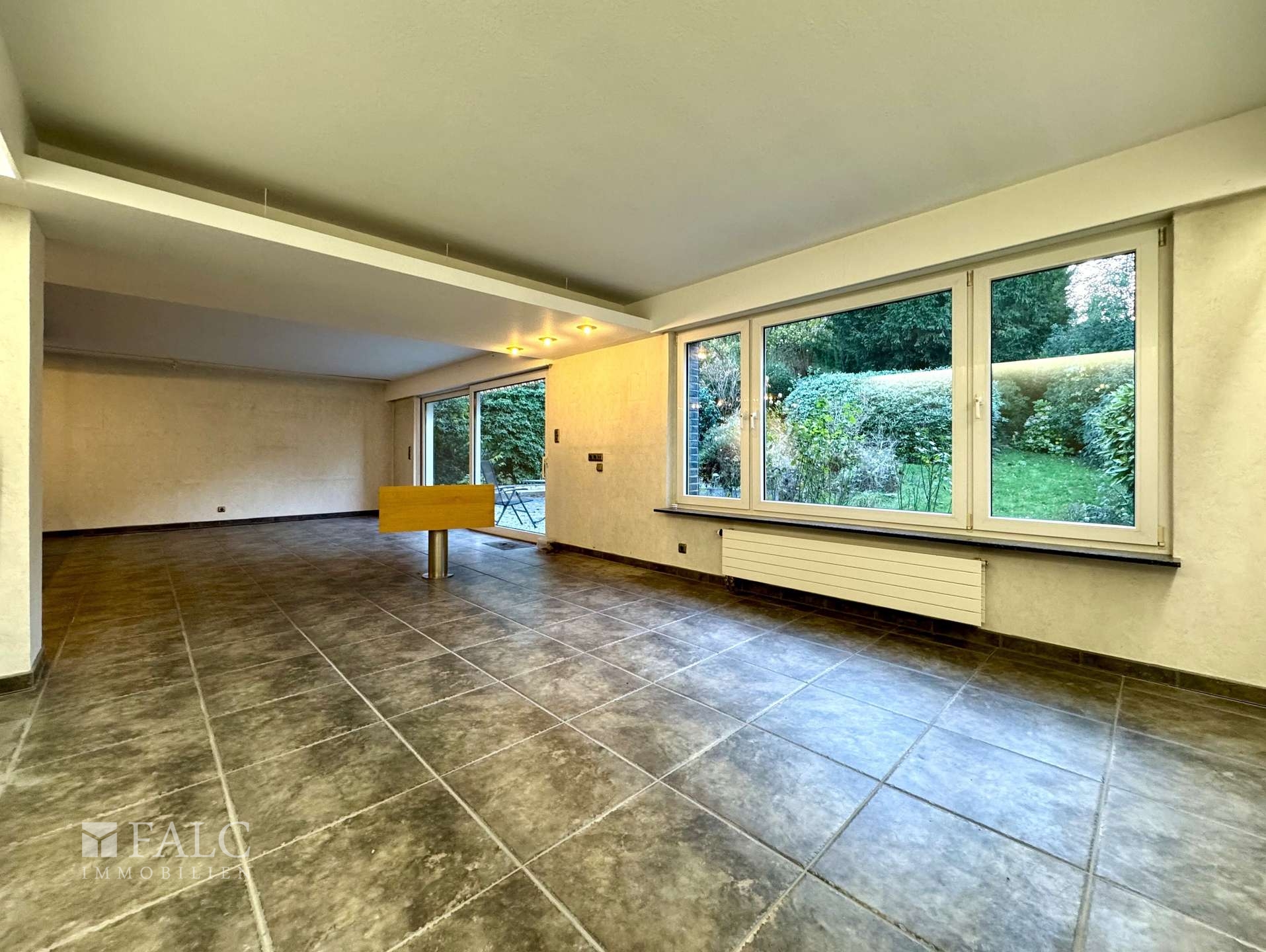 Vom Wohnraum aus gelangen Sie auf die breite Terrasse und in den großen Garten – ein echtes Naturrefugium, das Kindern Raum gibt, sich frei zu entfalten, und Erwachsenen Erholung nach einem langen Tag schenkt.