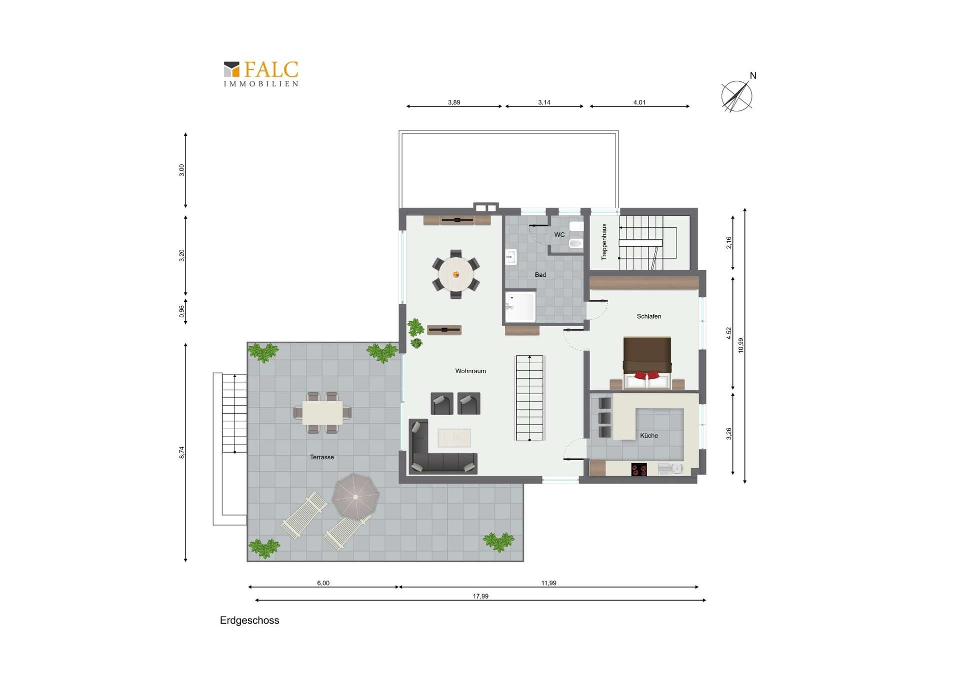 Über die offene, markante Treppe erreichen Sie das Erdgeschoss, das durch seine Weite und den direkten Blick in den Garten sofort begeistert. Die großen Glasflächen holen das Grün des Gartens in den Wohnbereich hinein und schaffen eine Atmosphäre, die gleichzeitig modern, offen und gemütlich ist.