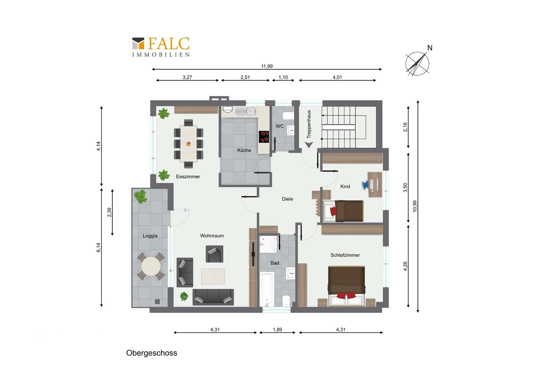 Die Küche ist klassisch geschnitten und bietet viel Raum für gemeinsames Kochen und Genießen. Das helle Tageslichtbad sowie das separate Gäste-WC sorgen für Komfort, während das große Schlafzimmer und das freundlich wirkende Kinderzimmer ideale Rückzugsorte bieten.
