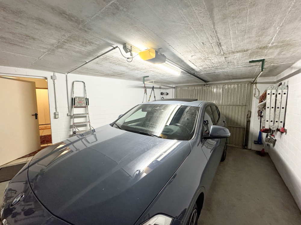 Besonders praktisch ist die integrierte Garage mit direktem Hauszugang. Zusätzlich bietet der Teilkeller mit Heizungsraum und separatem Vorratskeller viel Platz für Lagerung oder Hobbys. Über eine feste Treppe erreicht man den Dachboden, der weiteren Stauraum und Ausbaupotenzial bietet.