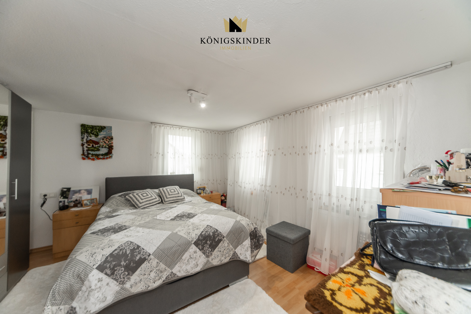 Das Haus selbst ist eher schmal geschnitten und zeigt sich in einem einfachen, teilweise renovierungsbedürftigen Zustand. Die Raumaufteilung ist dennoch praktisch: Im Erdgeschoss befinden sich ein Wohnzimmer und ein Badezimmer, im Obergeschoss die Küche, ein weiteres Wohnzimmer und ein Schlafzimmer. Das Dachgeschoss bietet drei weitere Zimmer mit flexiblen Nutzungsmöglichkeiten.