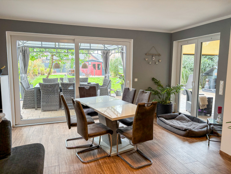 Im Erdgeschoss empfängt Sie eine Diele, von der aus rechts das Duschbad erreichbar ist. Das Herzstück des Hauses bildet das großzügige Wohn- und Esszimmer, das durch seine Offenheit und Helligkeit überzeugt. Von hier aus gelangt man direkt auf die überdachte Terrasse und in den weitläufigen Garten – ein wahres Paradies für Kinder zum Spielen und Toben, aber auch ein idyllischer Ort für gemütliche Stunden im Freien. Die offene Küche fügt sich nahtlos in den Wohnbereich ein und bietet ideale Bedingungen für gemeinsames Kochen und geselliges Beisammensein.