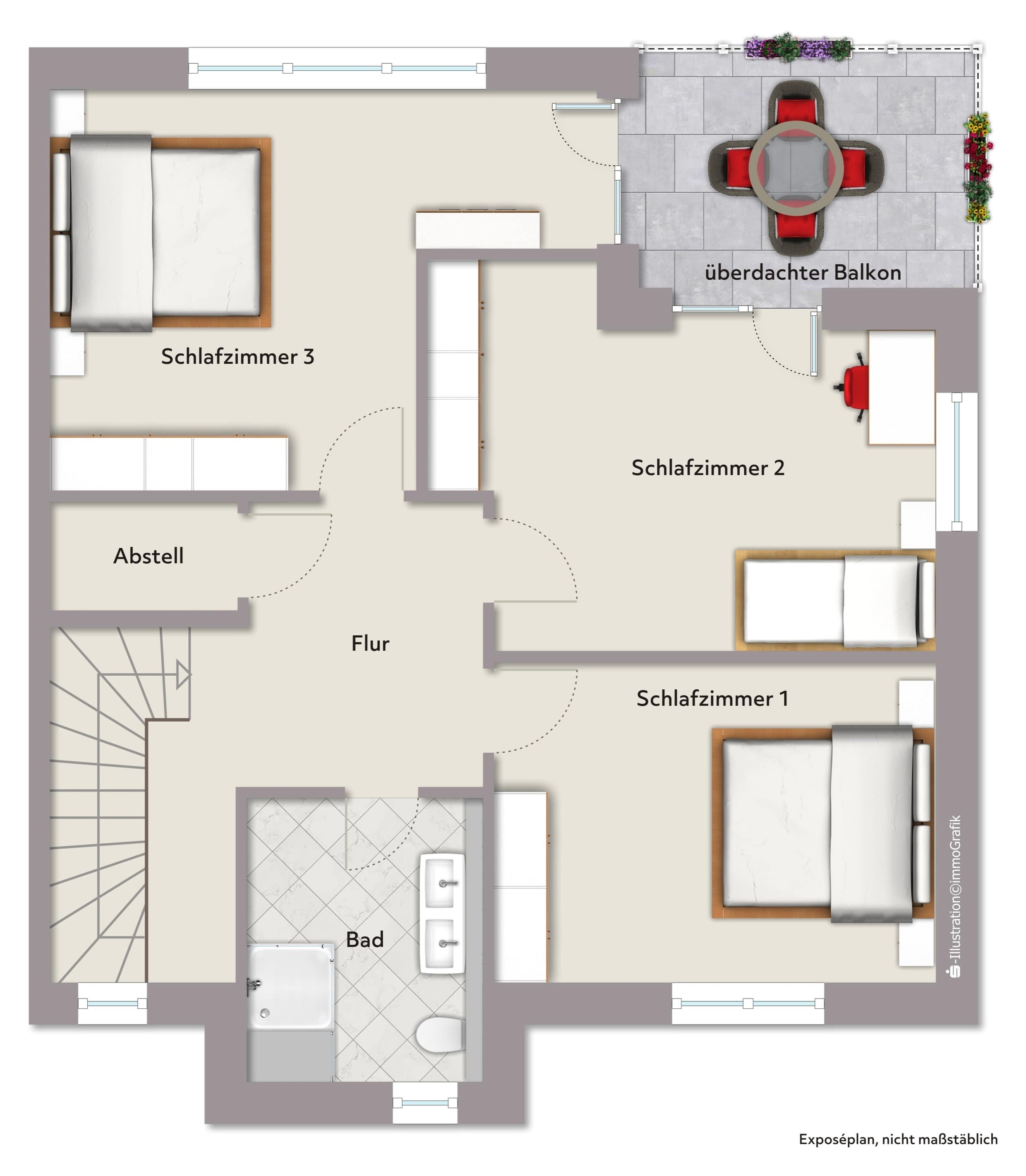 Im Obergeschoss führt ein zentraler Flur in die verschiedenen Räume. Das moderne Badezimmer ist mit einer bodentiefen Dusche, einem Doppelwaschbecken und einem WC ausgestattet. Ein weiterer Abstellraum sorgt auch hier für zusätzlichen Stauraum. Darüber hinaus befinden sich auf dieser Etage ein Schlafzimmer, ein weiteres Zimmer, das derzeit als Wohnzimmer genutzt wird, sowie eine Küche. Vom Obergeschoss aus haben Sie Zugang zu einem überdachten Balkon, der zum Entspannen im Freien einlädt.