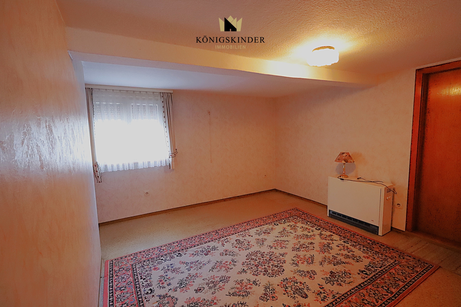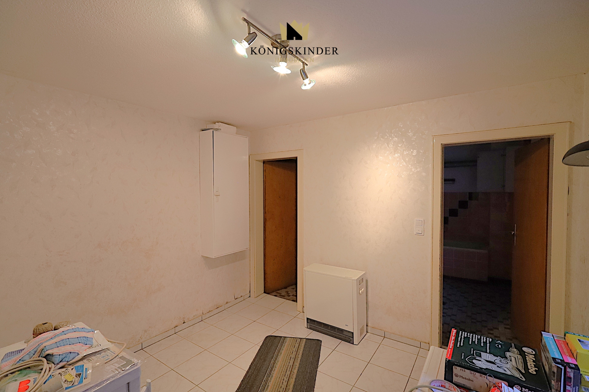 Im Erdgeschoss, erreichbar über zwei Treppen von der Seitenstraße aus und eine Zufahrt, befinden sich zwei Zimmer, die Wohnküche, ein Zwischenraum als Hauswirtschaftsraum, das Bad und das separate WC.