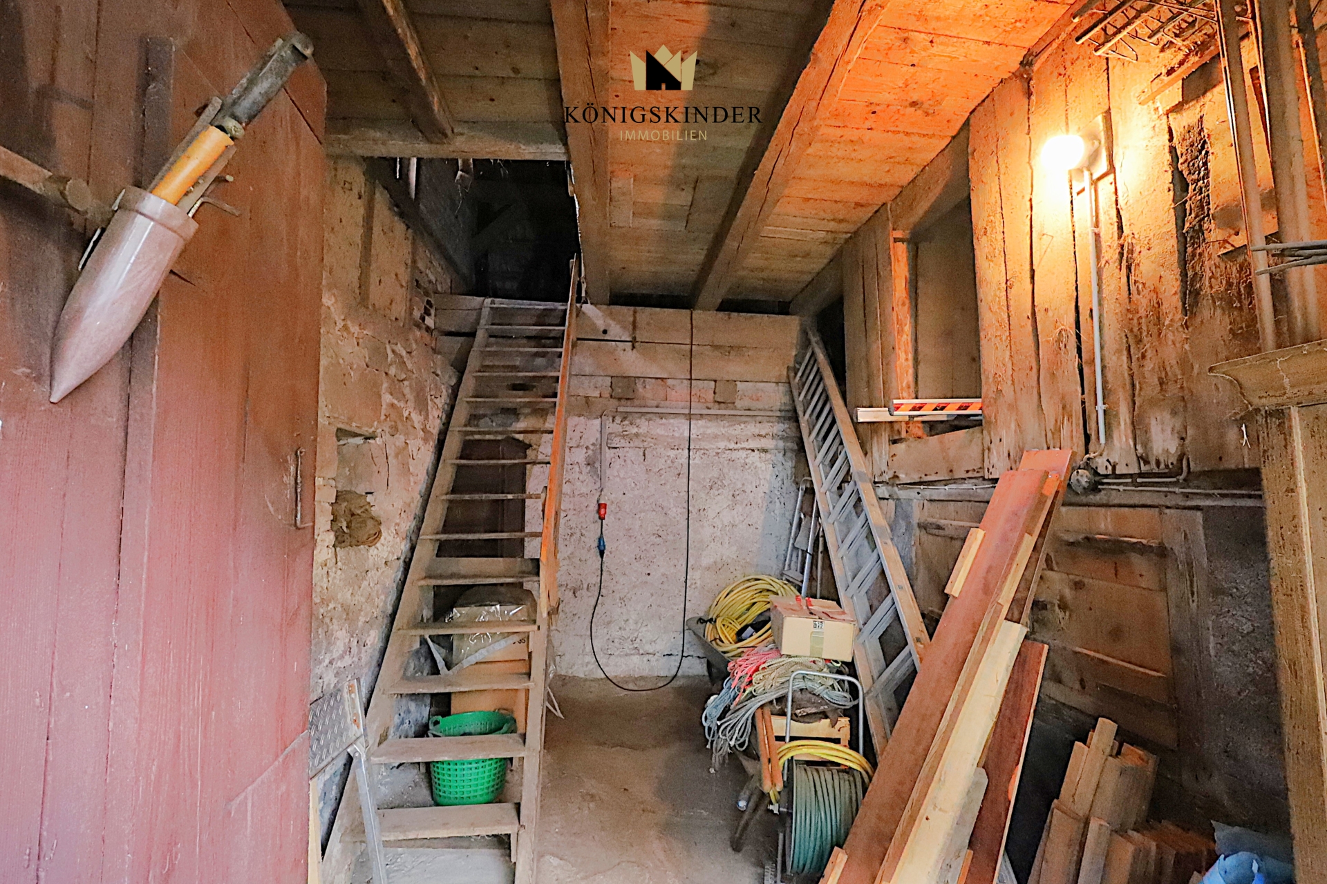 Der Keller ist massiv in den Hang hineingebaut mit einem Abstellraum zur Talseite und einem sog. "Schlupf" unter dem Treppenaufgang.