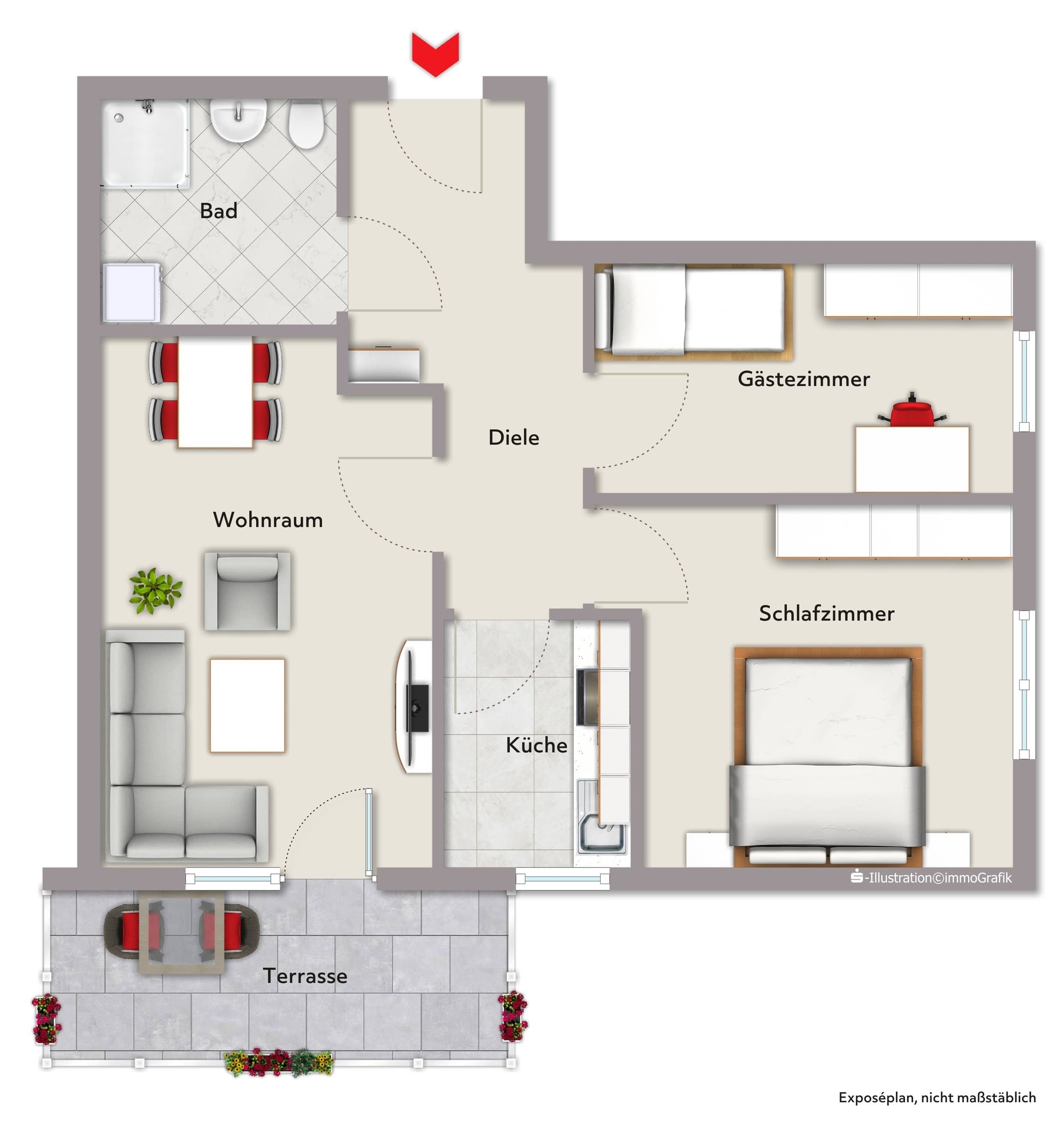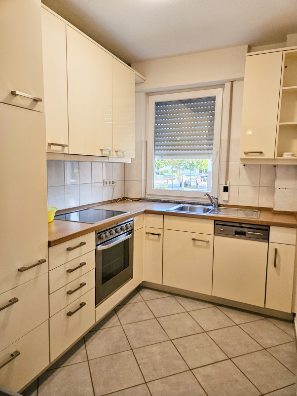 Die Wohnung bietet insgesamt drei Zimmer, bestehend aus einer separaten Küche (zeitlose Einbauküche im Kaufpreis enthalten), zwei Schlafzimmern sowie einem Wohn-/Essbereich. Das Badezimmer ist funktional ausgestattet, inklusive einer komfortablen, bodengleichen Dusche. Ein großer überdachter Balkon mit Markise erweitert den Wohnbereich nach draußen und lädt zu entspannten Momenten an der frischen Luft ein.