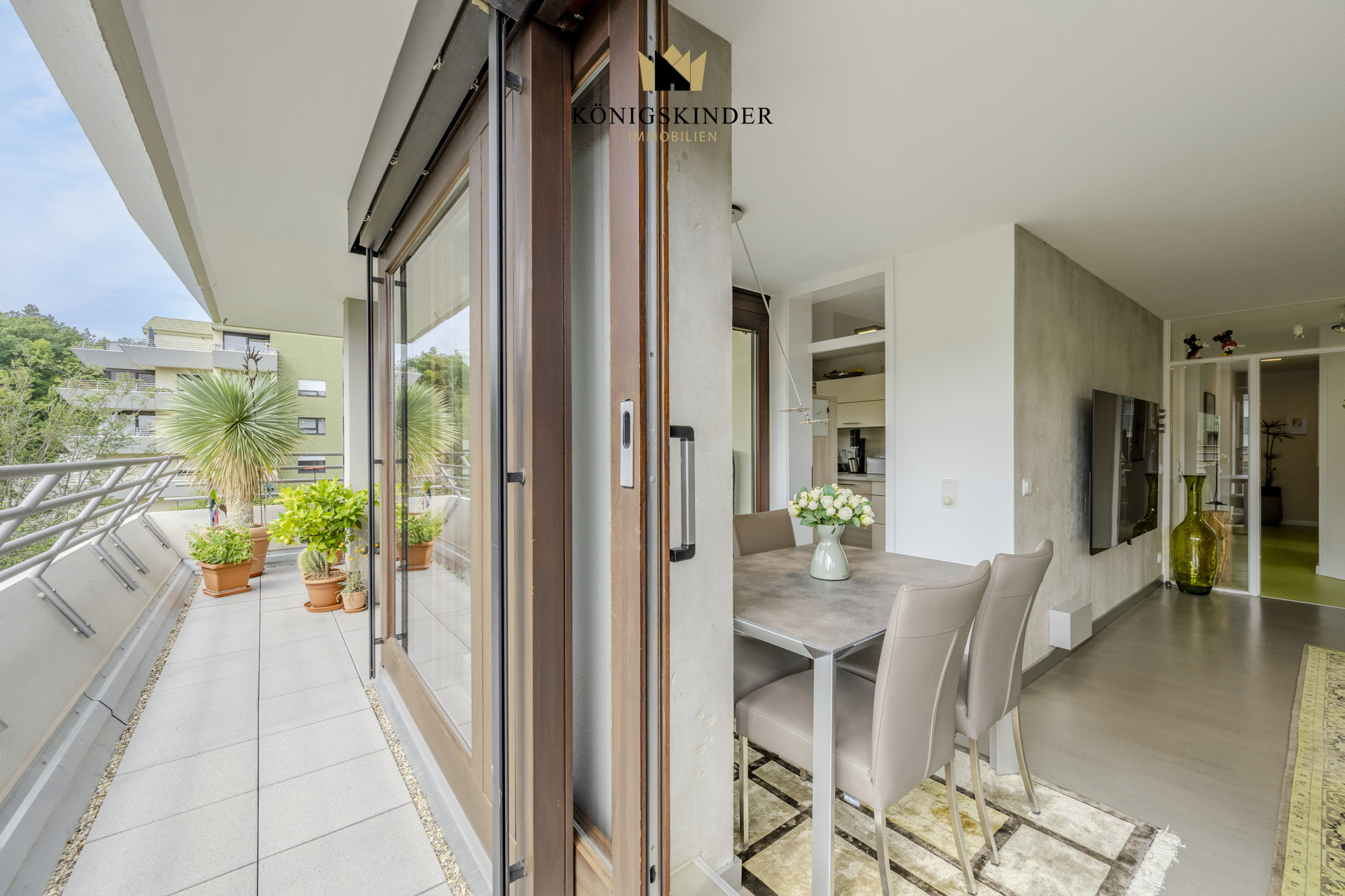 Die Terrasse ist so ausgerichtet, dass man eine Panoramaausicht ins Grüne und in den umliegenden Stadtteil hat. Der Essbereich ist 2-seitig verglast und bietet die selbe Aussicht. Die Einbauküche ist eine sehr hochwertige Markenküche mit adäquater Ausstattung und entsprechenden Elektrogeräten. Sie ist Bestandteil des Kaufpreises.