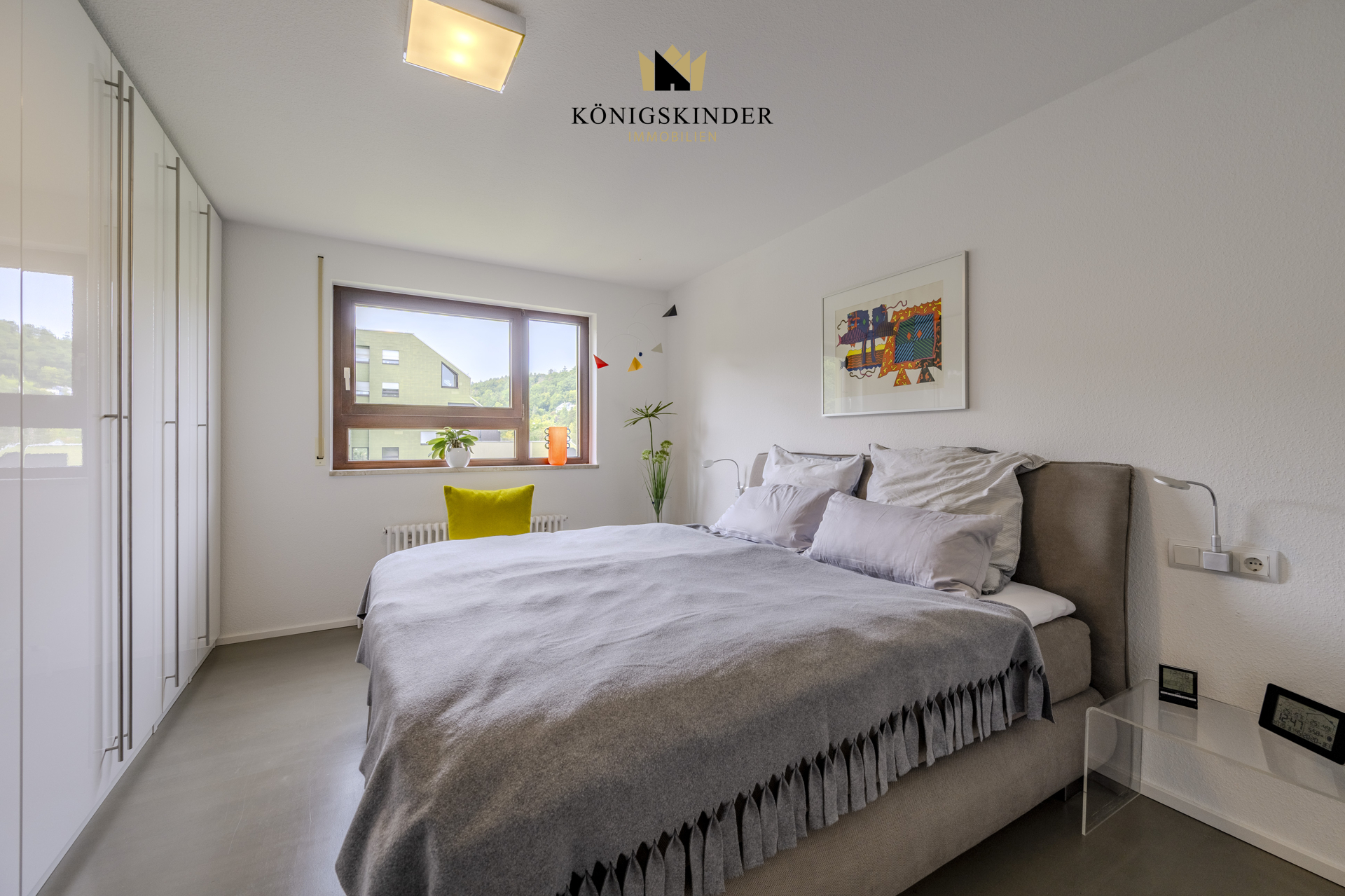 Betritt man die Wohnung, wird man von der modernen Garderobe empfangen, dieser gegenüber liegt das Schlafzimmer und daneben das separate Gäste-WC. Der großzügige und modern geschnittene Wohn- und Essbereich besticht mit Echtholzparkett, großen, bodentiefen und lichtdurchfluteten Fensterelemten. Alle Fenster verfügen über elektrischen Rollläden.