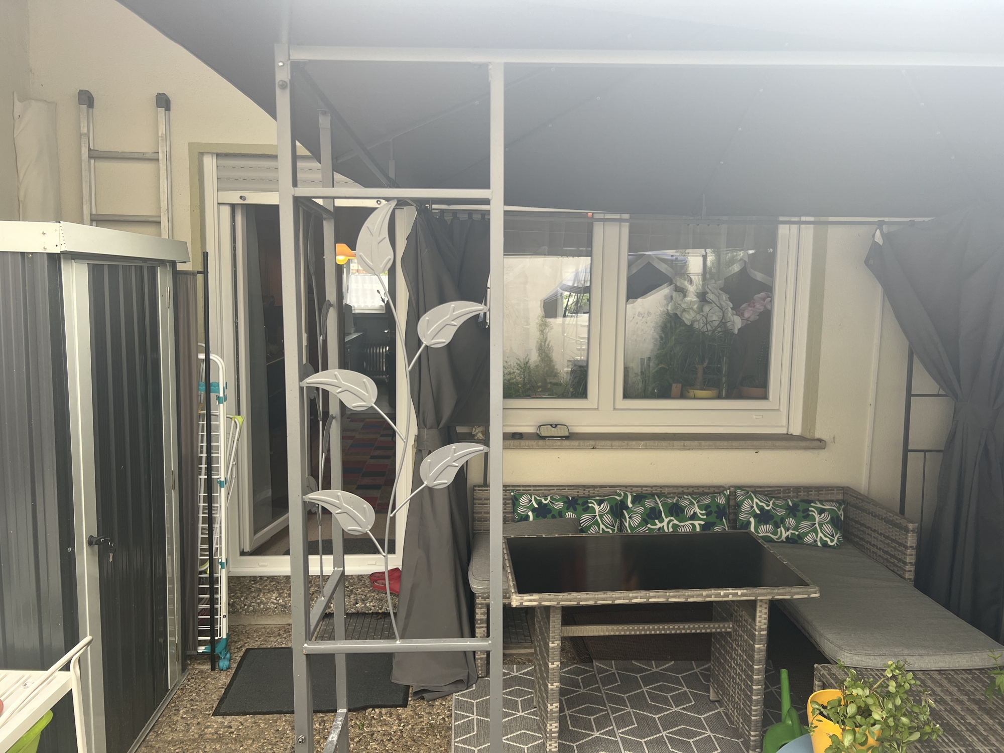 ***HIGHLIGHT!*** Im OG: TERRASSE: Wunderschöne große geräumige und mit einem gemütlichen Pavillon überdachte Terrasse auf der rückwärtigen Seite des Hauses mit Blick in die grüne Garten Oase voll blühender Pflanzen, Hecken und Sträucher ideal zum Verweilen, Frühstücken, Gärtnern und Feste feiern etc.