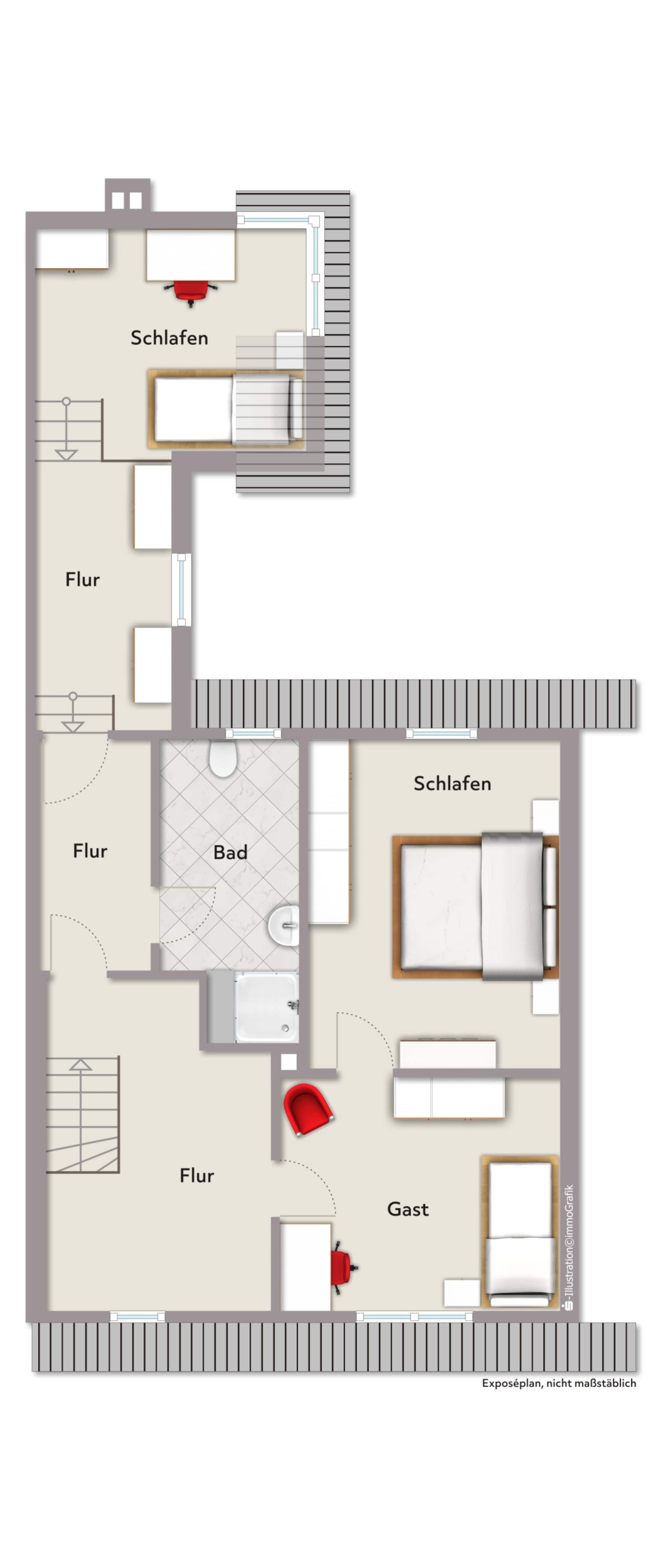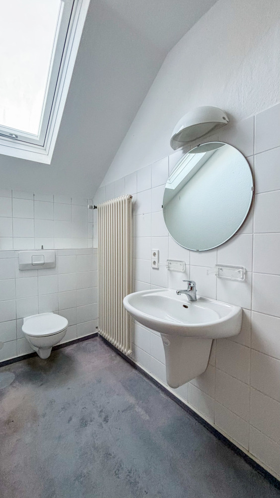 Im 1. Obergeschoss besticht besonders ein Zimmer im Anbau, das mit seinen hohen Decken und sichtbaren Holzbalken ein außergewöhnliches Raumgefühl schafft und zahlreiche Nutzungsmöglichkeiten bietet – etwa als Arbeitsbereich, Atelier oder zusätzlicher Wohnraum. Ergänzt wird die Etage durch zwei Schlafzimmer und ein weiteres Badezimmer.