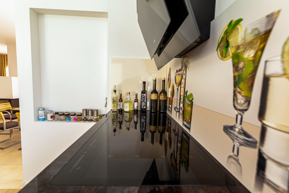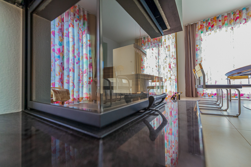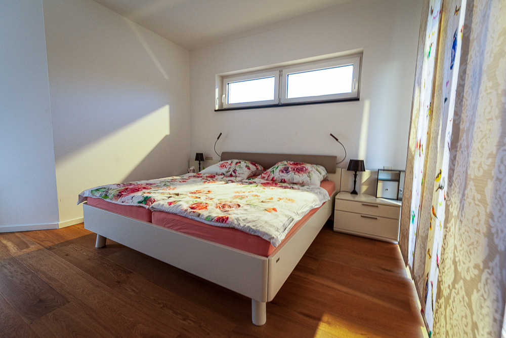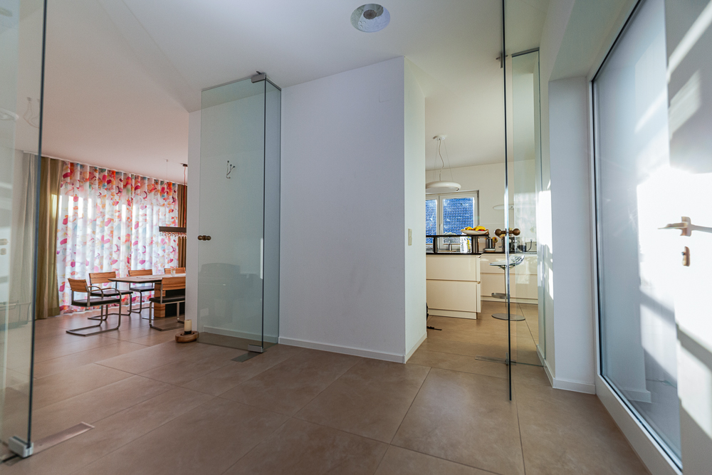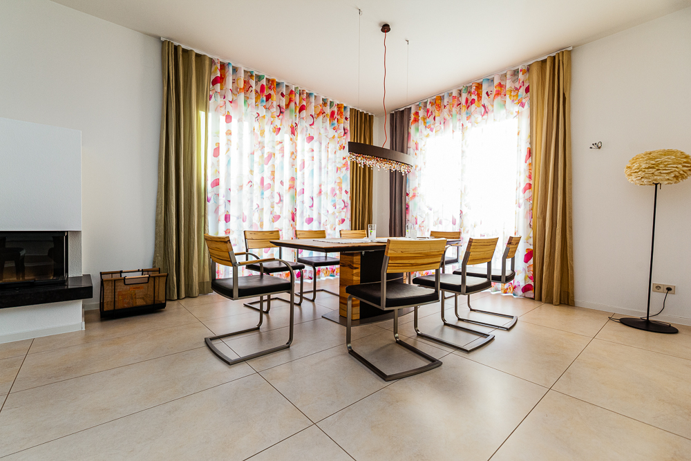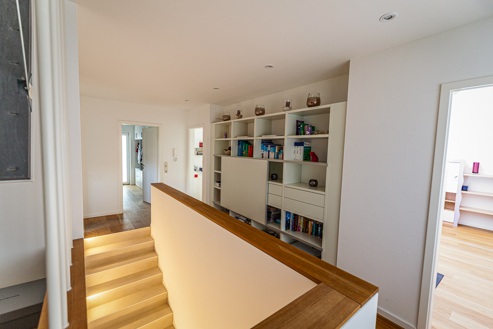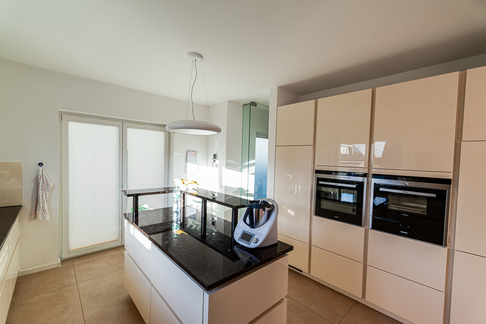 +moderne und lichtdurchflutete Architektur+ +großzügige Raumaufteilung +2 Bäder +Gäste-WC +hochwertige Einbauküche mit allen Geräten +hochwertige Bäderausstattung +Fußbodenheizung +großflügelige Glastüren +große bodentiefe Fenster mit 3-Fachverglasung +hochwertige Bodenbeläge (großformatige Fliesen und Parkett) +Südwestterrasse und Südwestbalkon +verglaster Kamin +Solaranlage für Warmwasserbereitung +geflieste Garage mit Starkstromanschluss +Fassaden sind wärme gedämmt