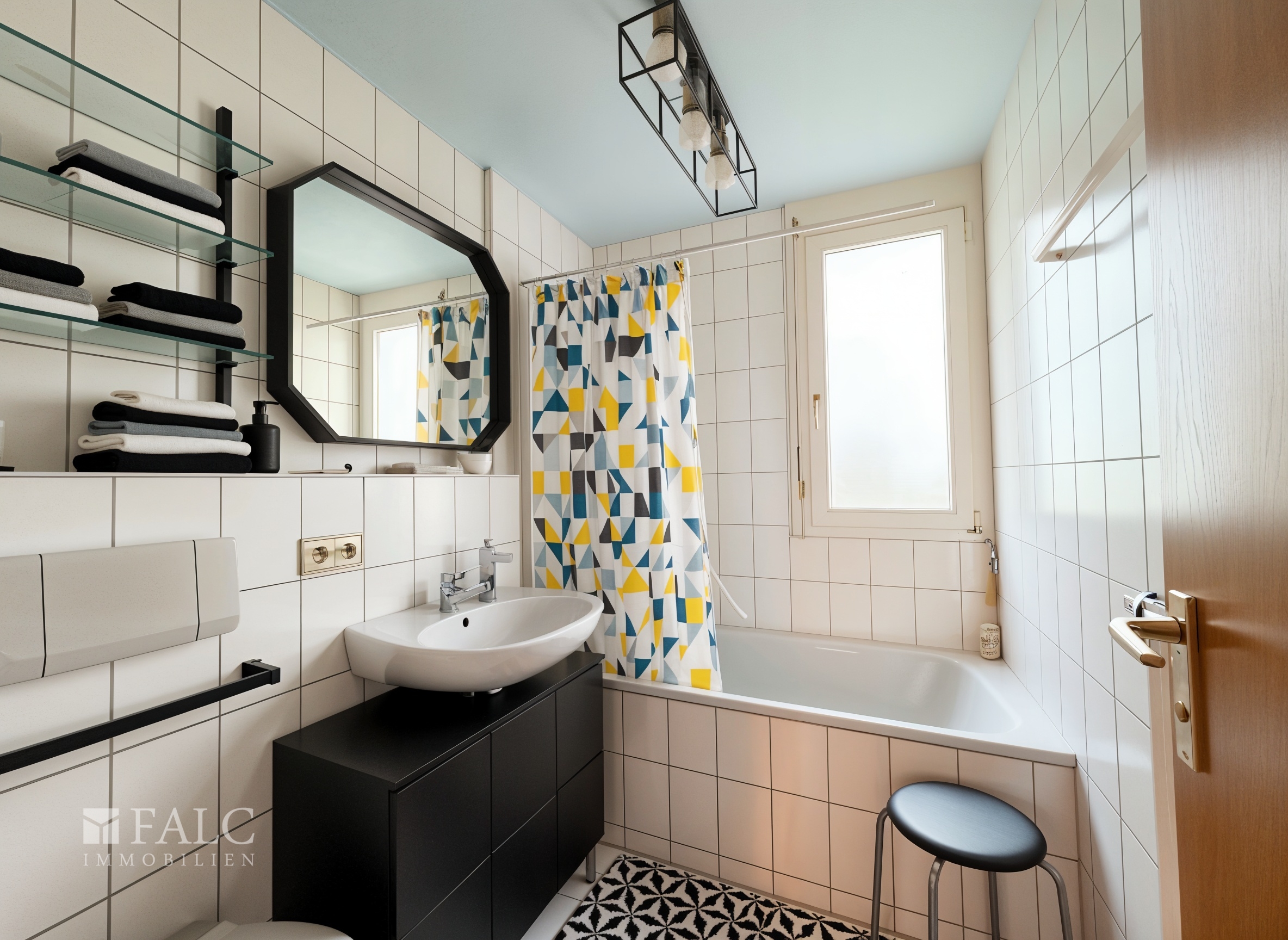Das Badezimmer ist mit einer Badewanne, einem Waschbecken und einem WC ausgestattet. Helle Fliesen und ein Fenster sorgen für eine angenehme Helligkeit und Belüftung.