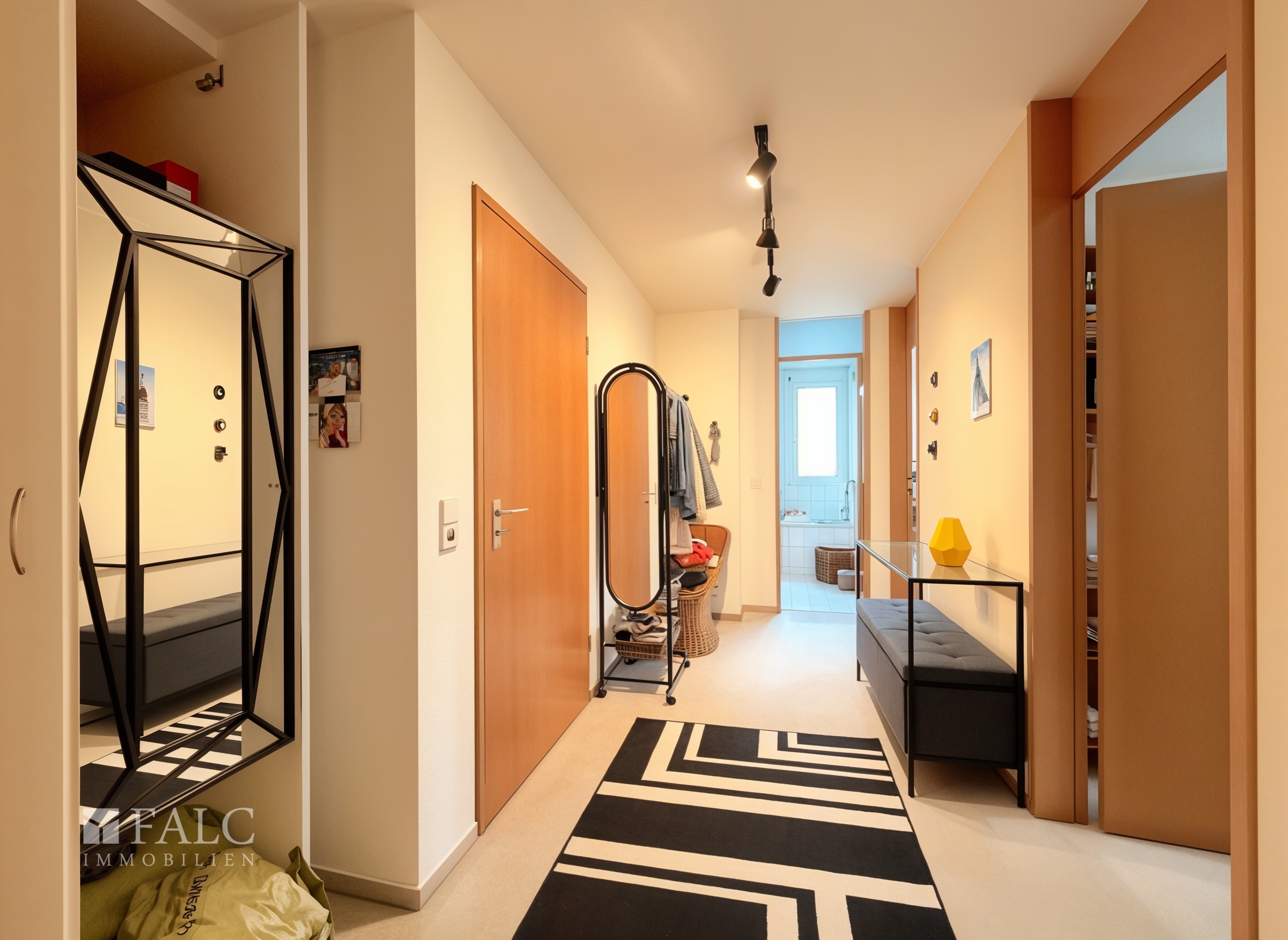 Geradeaus gelangen Sie in das helle Wohnzimmer, das durch große Fenster viel Tageslicht bietet. Der Raum verfügt über genügend Platz für eine gemütliche Sofaecke und einen Essbereich. Von hier aus haben Sie Zugang zum großzügigen Balkon, der zum Entspannen im Freien einlädt und einen schönen Blick ins Grüne bietet.