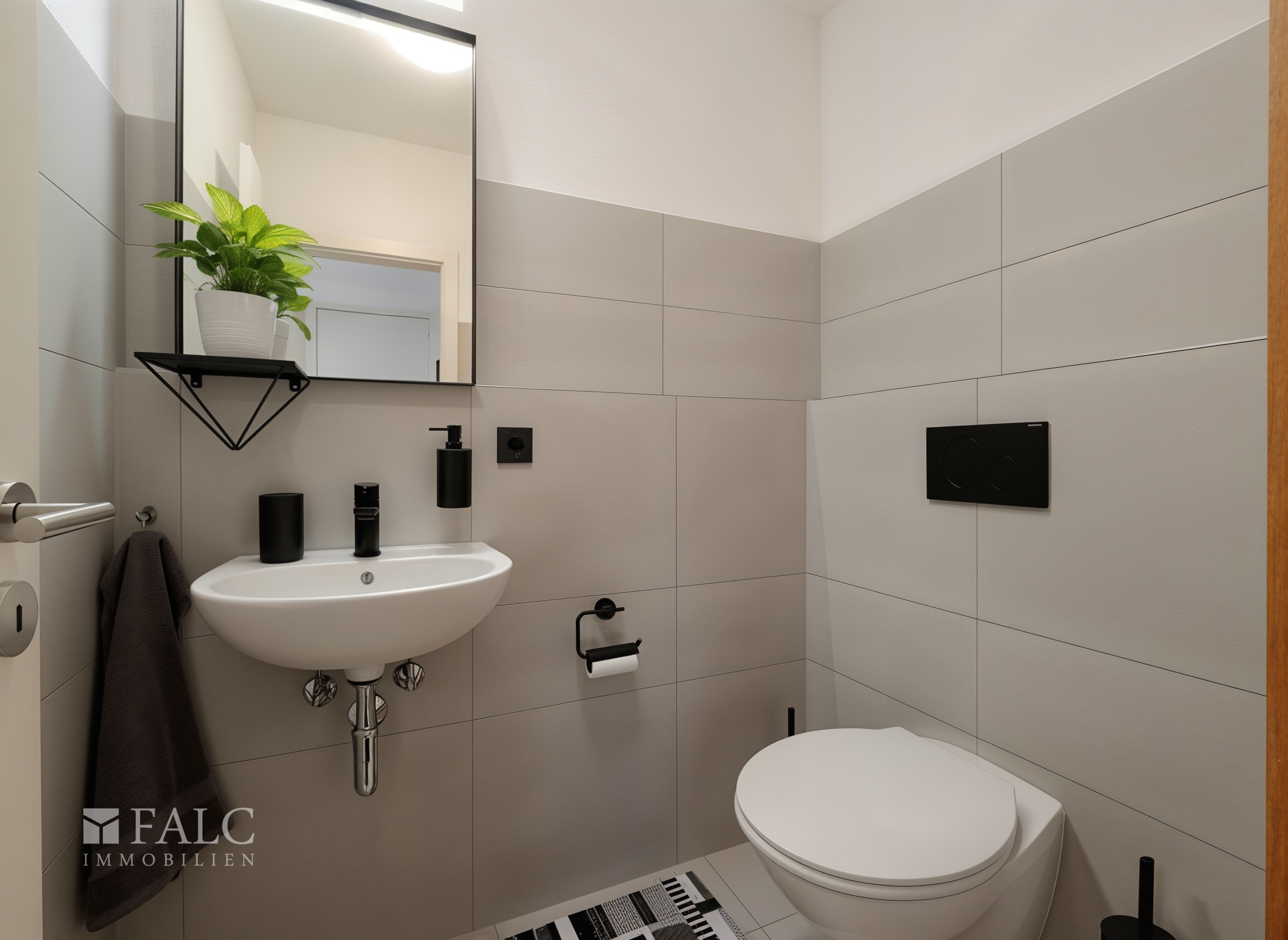 Beim Betreten dieser charmanten 3-Zimmer-Wohnung mit einer Wohnfläche von 67,04 m², werden Sie von einem einladenden Flur empfangen, der ausreichend Platz für eine Garderobe bietet. Rechterhand befindet sich das Gäste-WC, das mit Fliesen und einem praktischen Waschbecken ausgestattet ist.