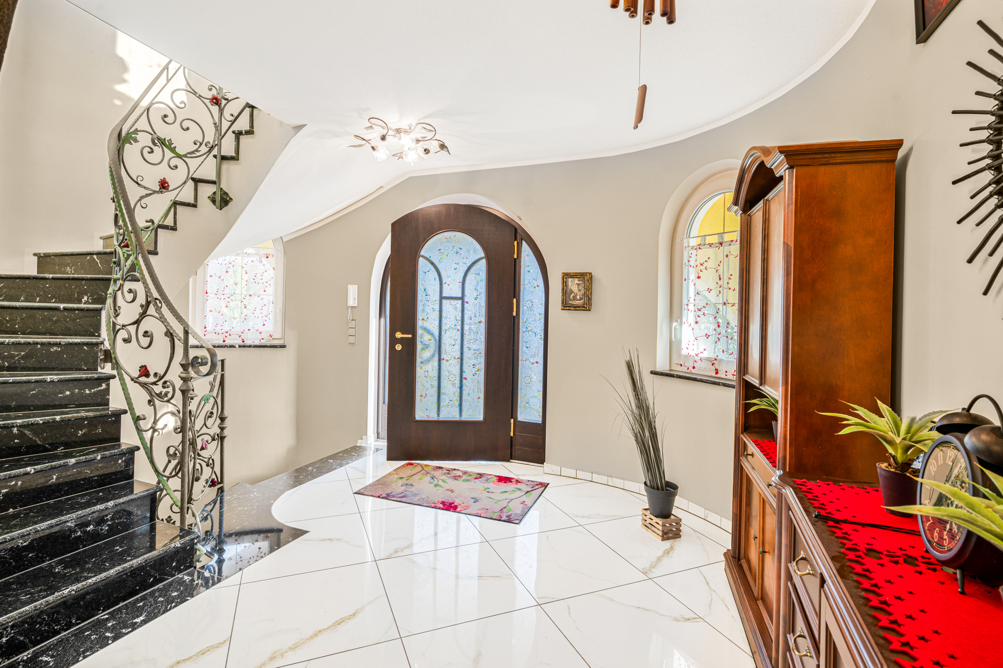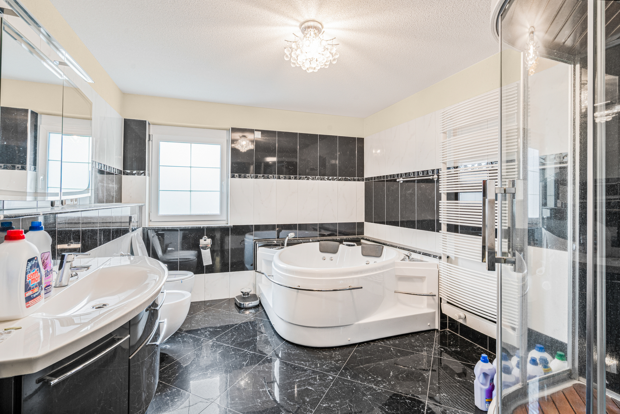 Die Villa bietet insgesamt acht Zimmer, darunter vier komfortable Schlafzimmer, die Platz für die ganze Familie bieten. Zusätzlich gibt es zwei stilvoll gestaltete Badezimmer sowie ein praktisches Gäste-WC. Für entspannte Stunden im Freien stehen Ihnen sowohl eine Terrasse als auch ein Balkon zur Verfügung, die zum Verweilen einladen.