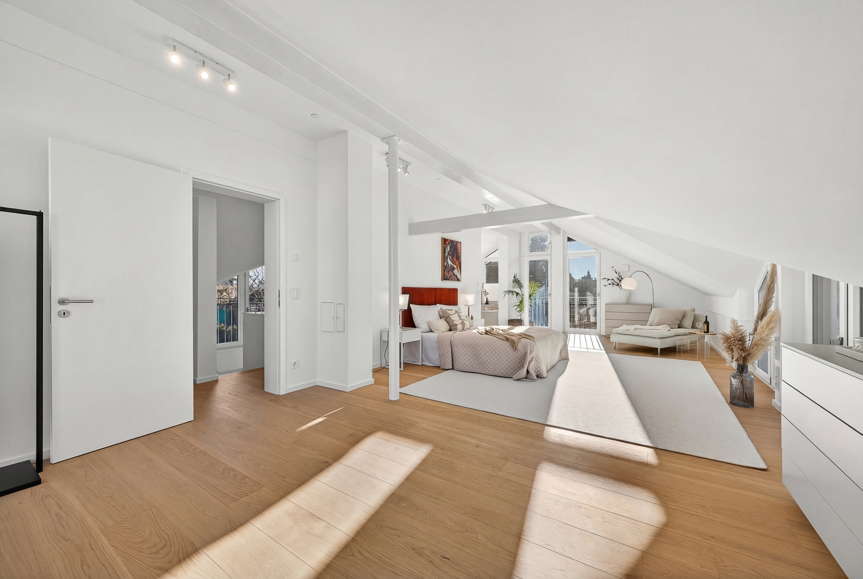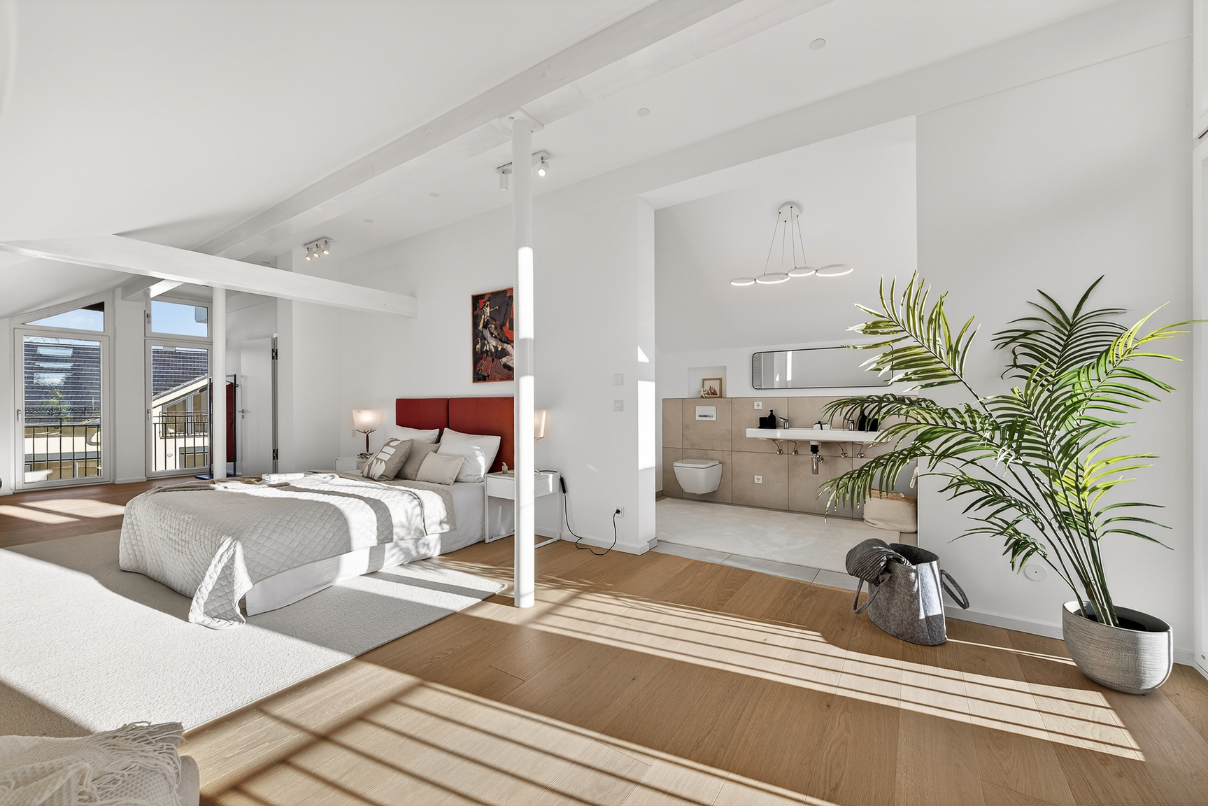 Im Dachgeschoss präsentiert sich das eindrucksvolle Master Bedroom mit en-Suite Bad; Armaturen von Dornbracht und Sanitärinstallationen von Villeroy & Boch zeichnen die hochwertige Ausstattung aus. Zwei weitere Bäder im Ober- bzw. Untergeschoss setzen zusätzliche Komfortakzente.