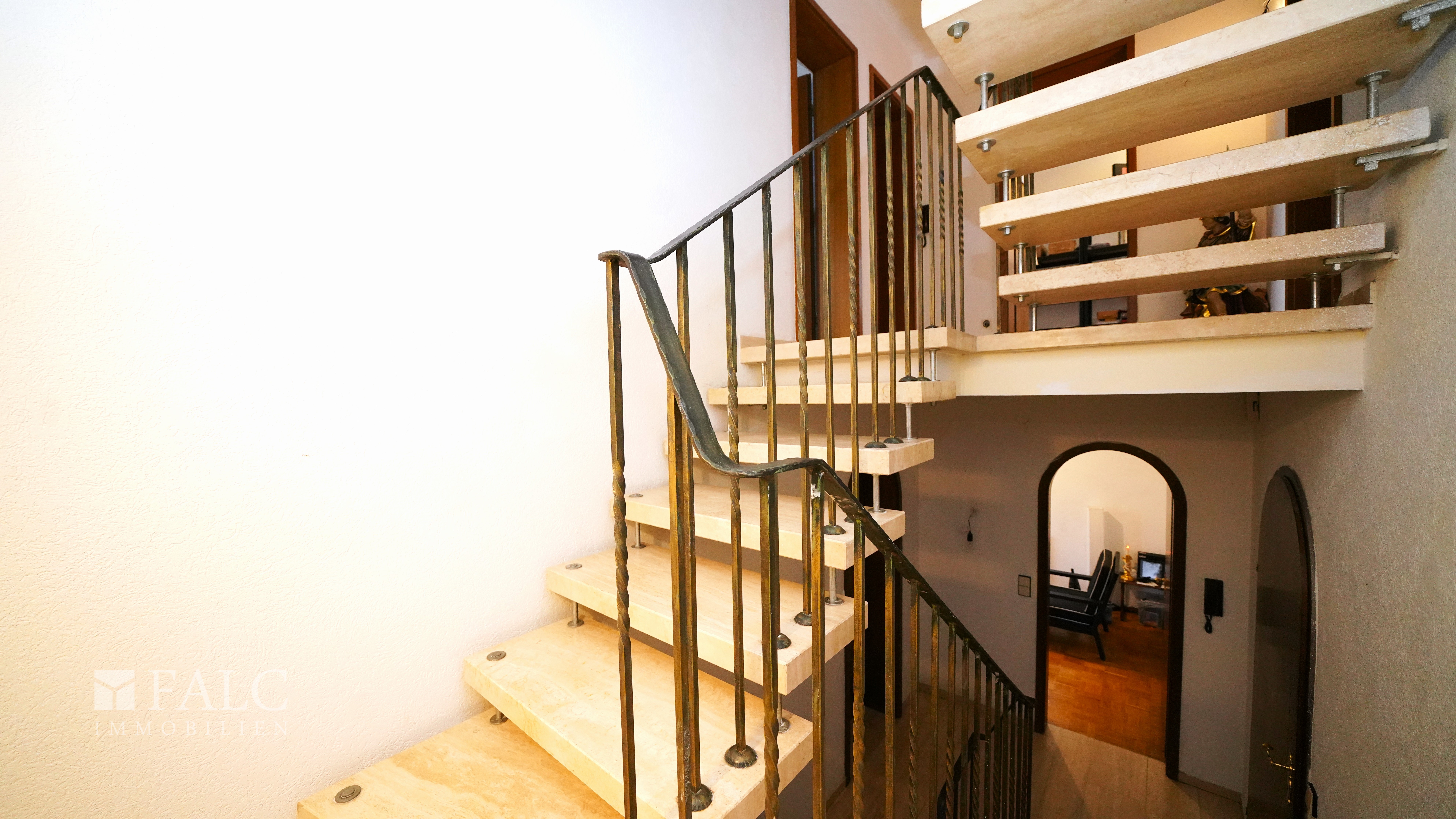 Durchlaufen Sie die hochwertigen Travertin-Treppen mit Stahlgeländer nach oben gelangen Sie in Ihrer Rückzugsoase. Hier empfängt Sie das Obergeschoss mit ausreichend vielen Zimmern und einem gemeinsamen Tageslicht-Bad.