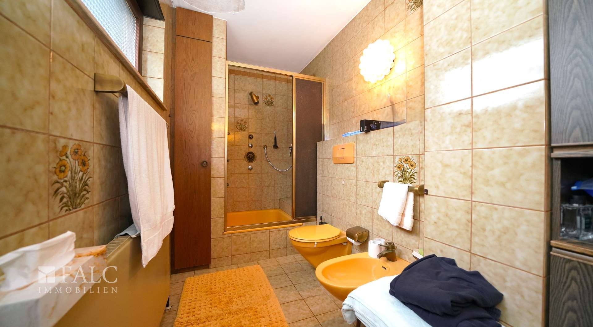 Das Badezimmer im Obergeschoss ist pflegeleicht gefliest und ausgestattet mit Doppelwaschbecken, WC und großer Duschkabine. Das Bad im Dachgeschoss verfügt ebenfalls über ein WC sowie eine Badewanne. Dieser befindet sich in einem derzeit renovierungsbedürftigen Zustand.