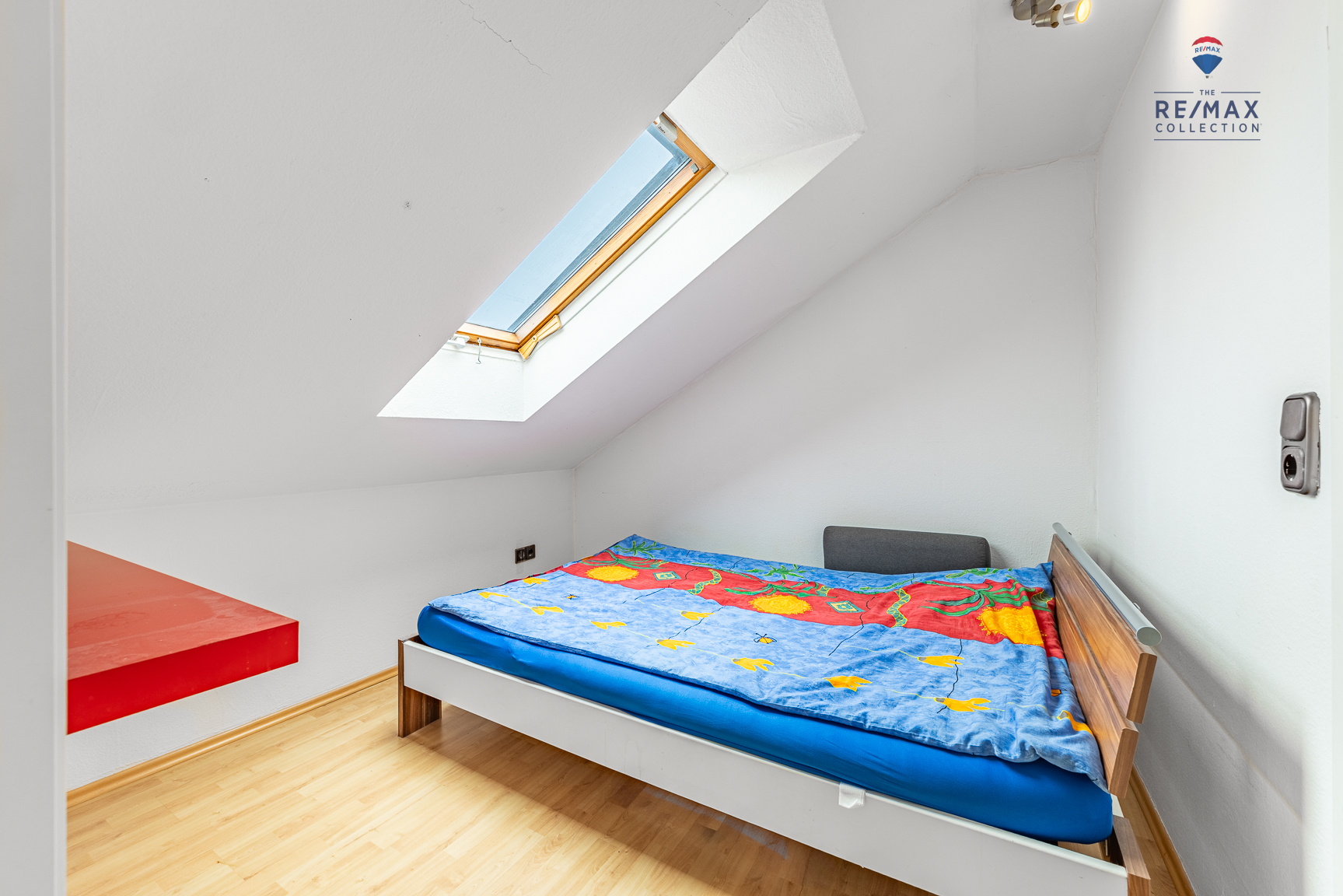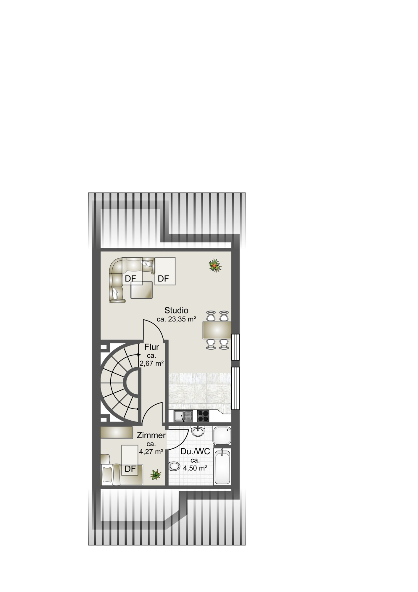 Dachgeschoss: Hier befindet sich ein geräumiges Studio bzw. Einliegerwohnung mit Küchenbereich. Auf der anderen Seite des Flurs gibt es einen „kleinen“ Schlafraum mit Dachflächenfenster und angeschlossenem Bad – ebenfalls mit Wanne und separater Dusche.