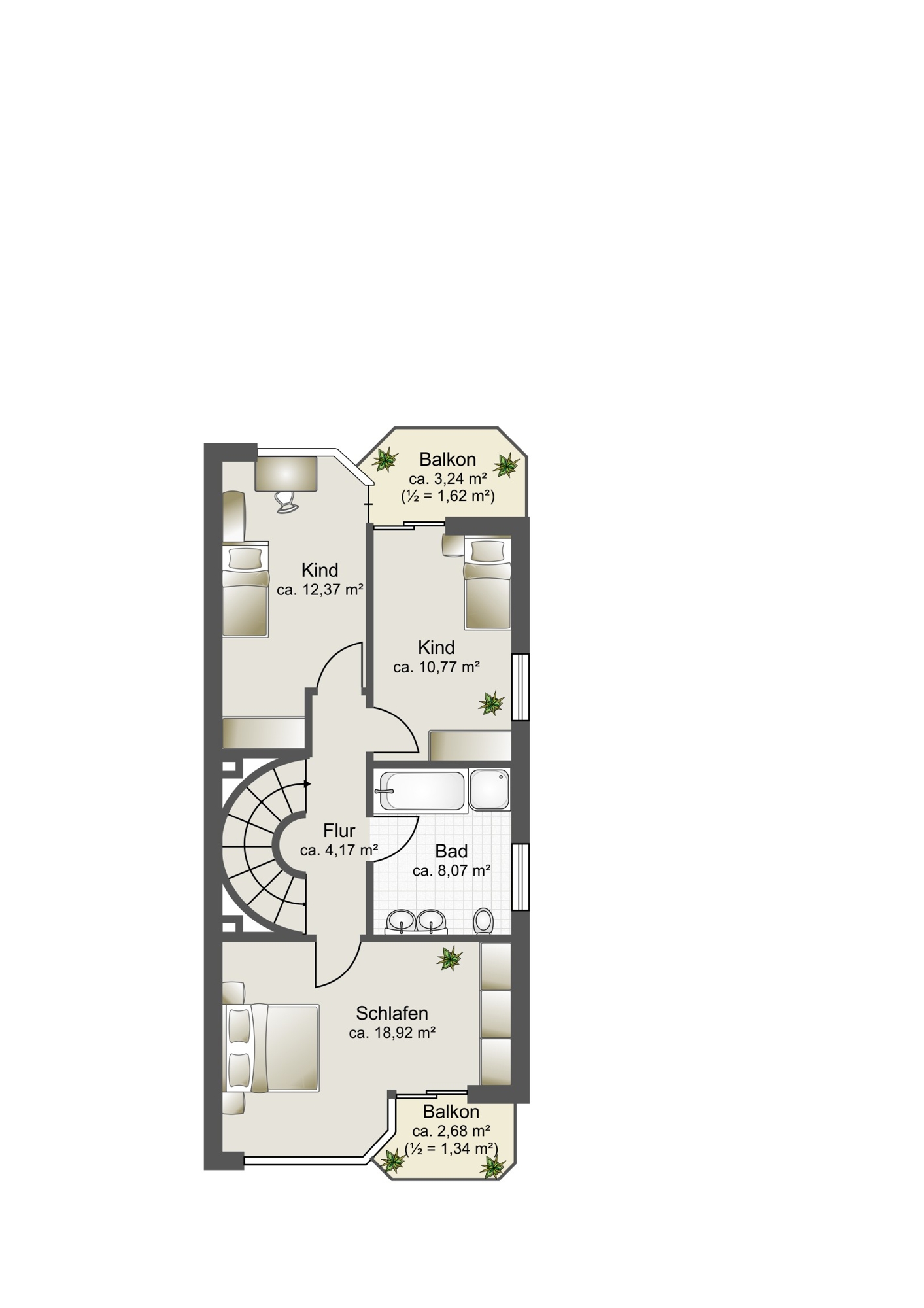 Obergeschoss: Vom Flur gehen drei Zimmer ab, alle mit Balkonzugang. Darüber hinaus finden Sie hier das Tageslichtbad mit Doppelwaschbecken, Badewanne und separater Dusche.