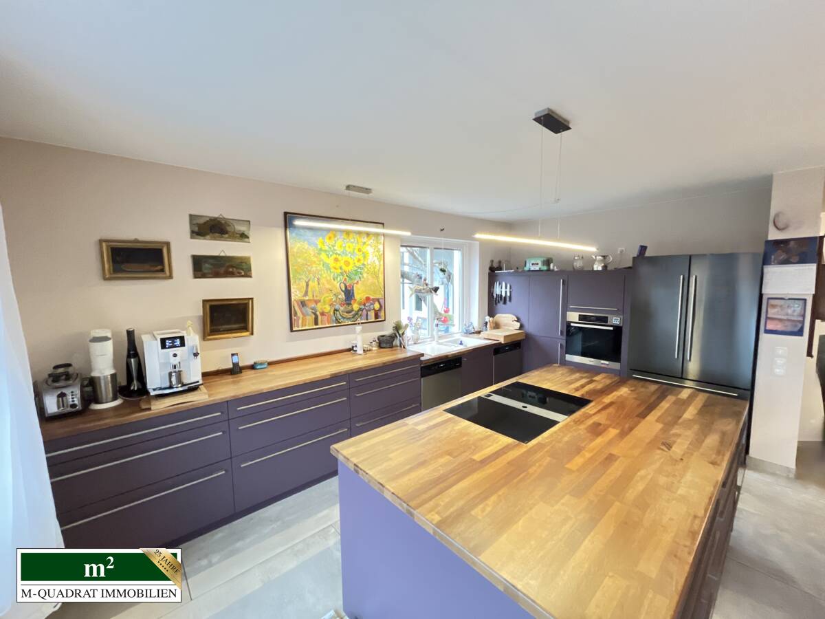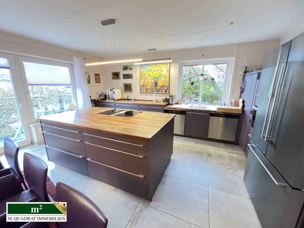 Das Erdgeschoss des Haupthauses wurde im Jahr 2016 umfassend modernisiert. Der Grundriss präsentiert sich offen, modern und lichtdurchflutet. Eine Fußbodenheizung sorgt für höchsten Wohnkomfort, ebenso wie die exklusive, maßgefertigte Küche mit Kochinsel. Ausgestattet mit einem BORA-Kochfeld mit integrierter Abluft, einem großen Standkühlschrank mit Eiswürfelbereiter und hochwertigen Einbaugeräten erfüllt sie höchste Ansprüche. Der angrenzende Balkon sowie die Südterrasse mit Außenkamin laden zu entspannten Stunden und stilvollen Abenden ein.