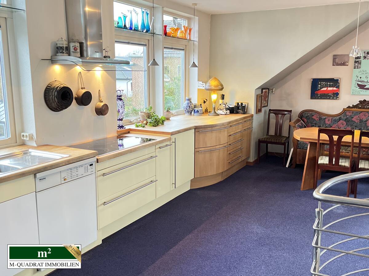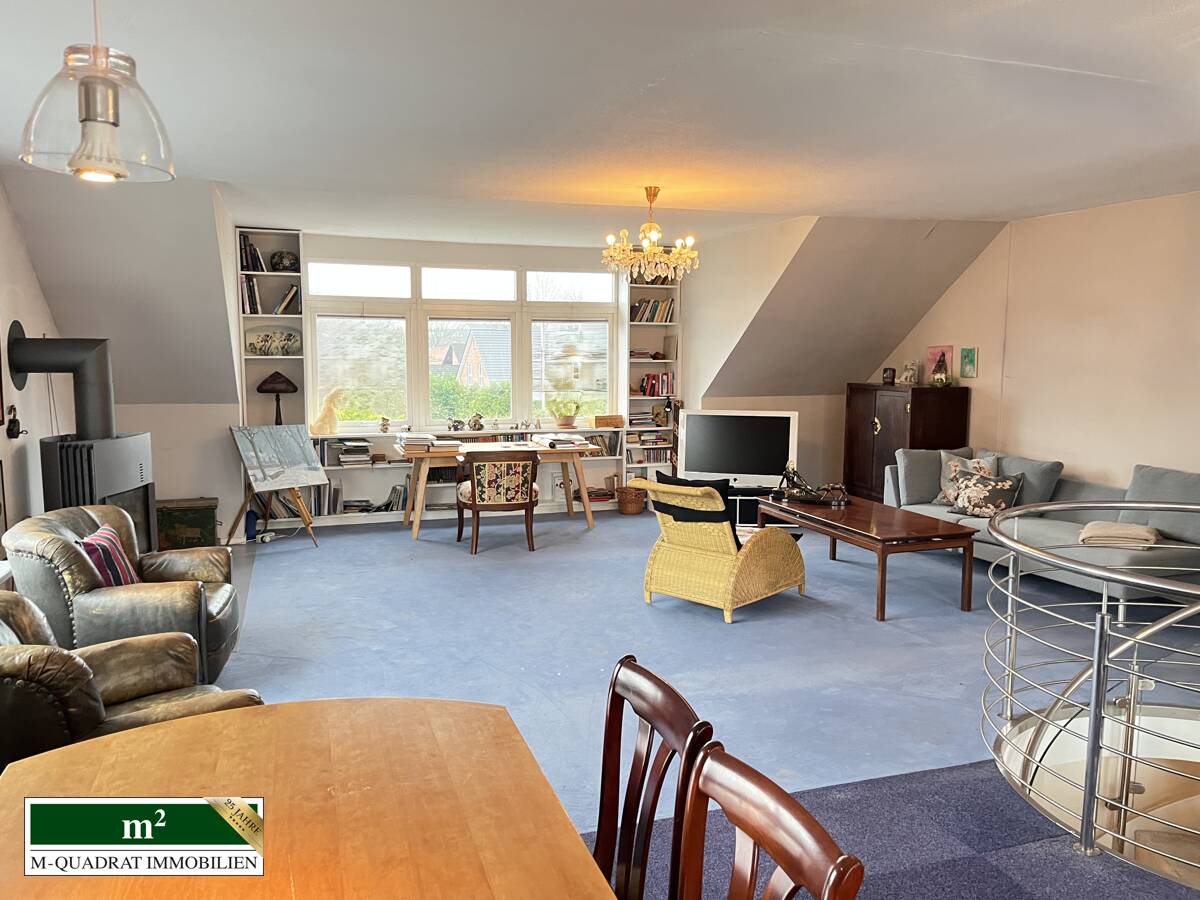 Im Jahr 1998 erfolgte der Ausbau des Dachgeschosses inklusive zusätzlicher Gauben, wodurch ein lichtdurchflutetes und weitläufiges Raumgefühl entstand. Auf dem Nebengebäude wurde ein Aufbau im Schwedenhausstil realisiert. Hier entstanden ein geräumiges Schlafzimmer mit Ankleide sowie ein Bad en Suite, die das Dachgeschoss hochwertig ergänzen. Aktuell bietet diese Etage fünf Zimmer, zwei Bäder und eine Küche. Der großzügige Wohnbereich mit Kaminofen und offener Küche wird von großflächigen Fensterfronten auf drei Seiten umgeben und vermittelt eine besondere Atmosphäre von Weite und Behaglichkeit. Eine elegante Spindeltreppe verbindet das Dachgeschoss mit dem Erdgeschoss des Haupthauses.