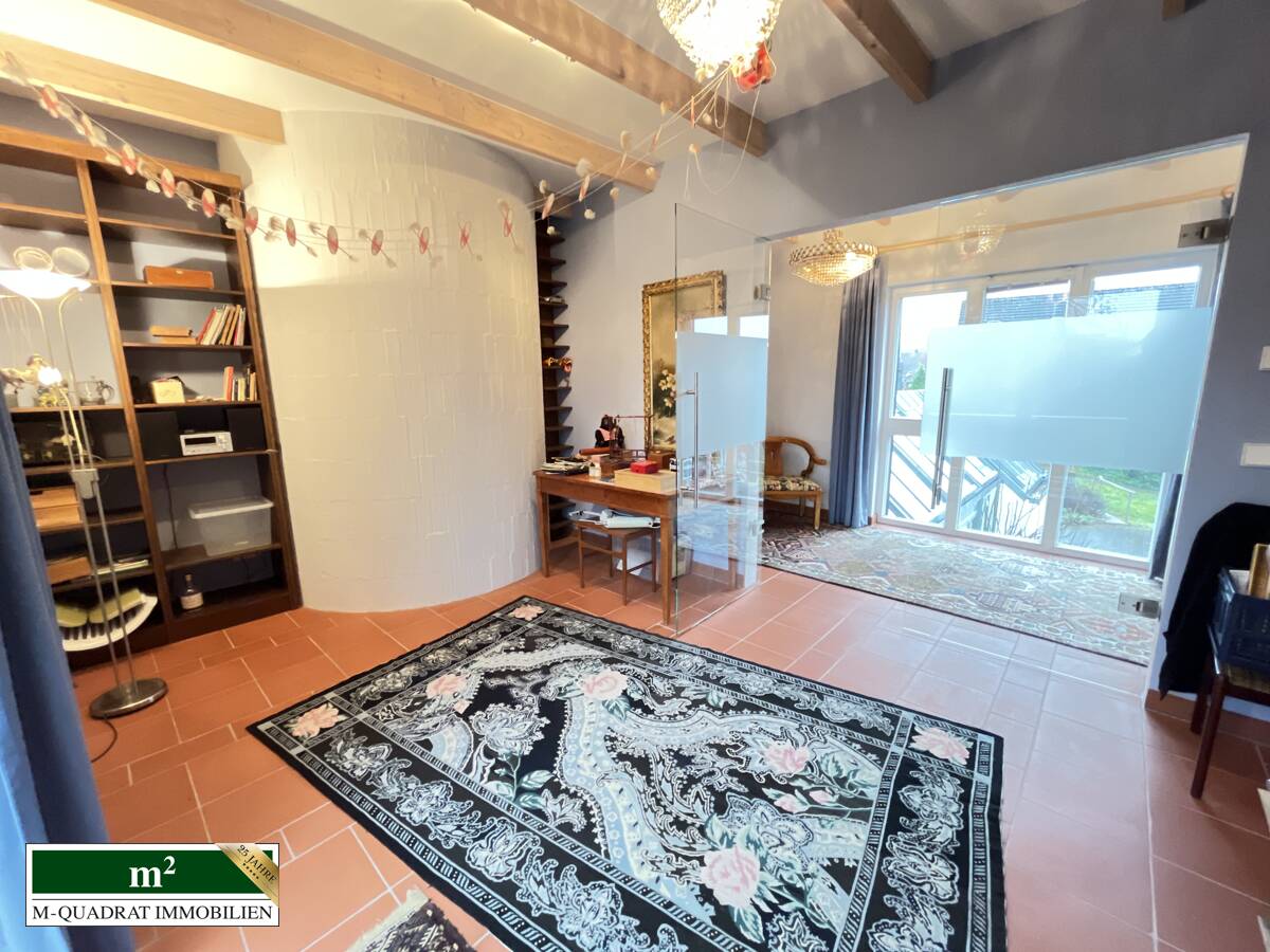 Ein besonderes Highlight ist der großzügige Anbau aus dem Jahr 2014. Hier befindet sich im Erdgeschoss der exklusive Wellnessbereich mit Schwimmbad und Sauna, während im Dachgeschoss zwei ruhige Büroräume untergebracht sind – ideal für konzentriertes Arbeiten. Auch hier verbindet eine Spindeltreppe die Ebenen.