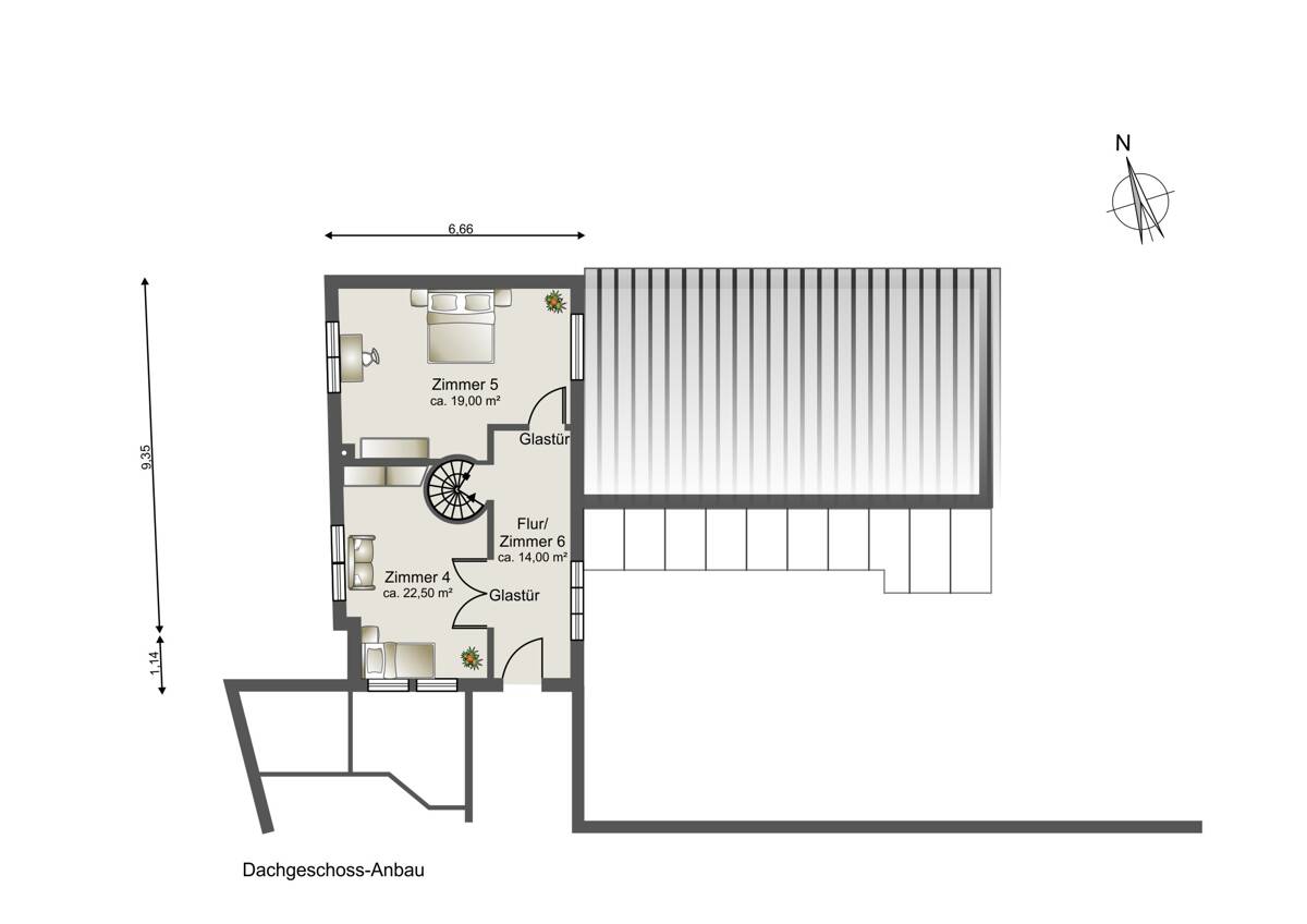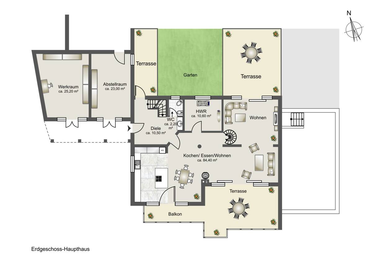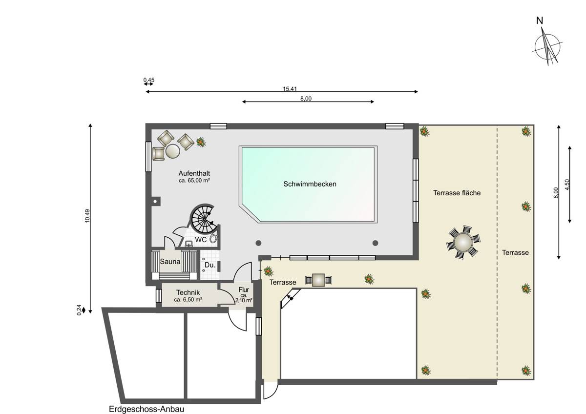 Anbau – Wellness- & Arbeitsbereich •Schwimmbecken mit Gegenstromanlage und integriertem Whirlpool •Reinigungsroboter zur Oberflächen- und Beckenwandreinigung •Elektrische Schwimmbadabdeckung •Sauna •Gäste-WC •Separater Duschbereich •Ruhe- oder Fitnessbereich •Spindeltreppe mit Zugang zum Dachgeschoss