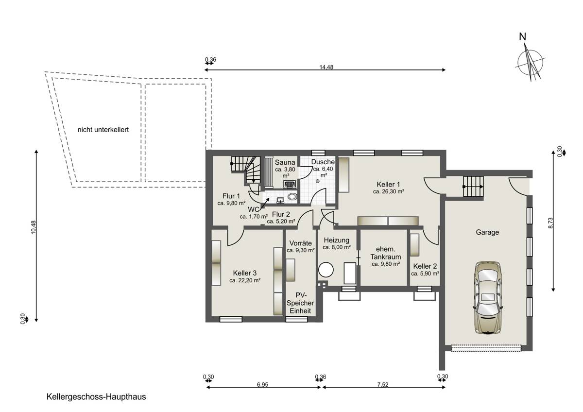 Kellergeschoss •Gäste-WC sowie separater Duschbereich •Sauna •Großzügiges Souterrain-Zimmer •Vielseitig nutzbarer Partyraum •Direkter Zugang zur Garage •Gas-Zentralheizung mit moderner Brennwerttherme