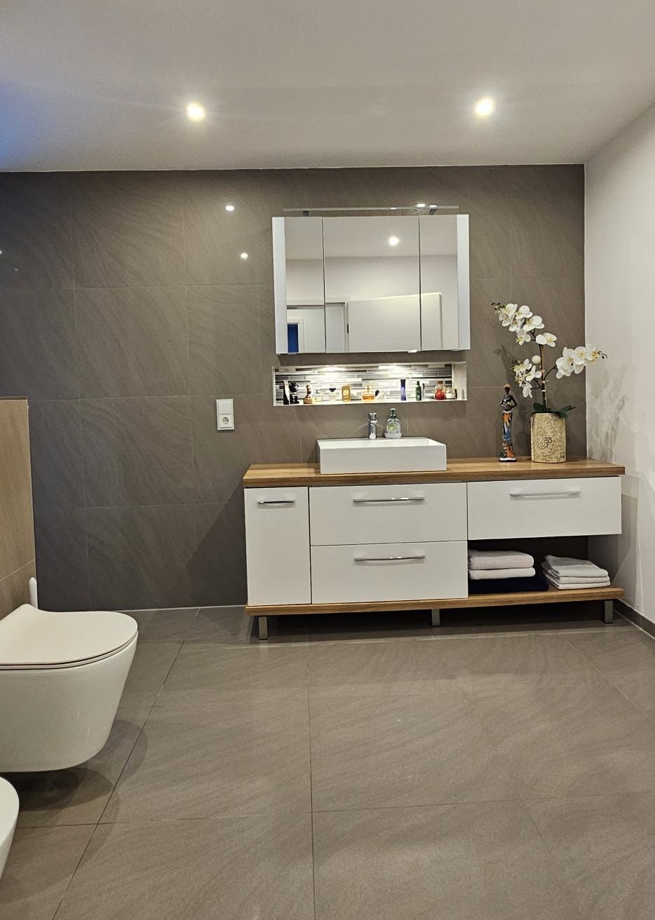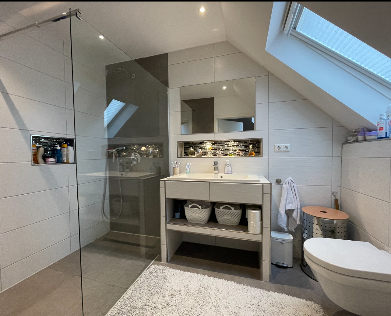 Maßnahmen im Anbau in 2017: - Badezimmer, Wasserleitungen und Elektrik - Fußbodenheizung im Erd- und Obergeschoss - Elektr. Rollos (außer Dachflächenfenster) - Fassade gedämmt - Dach gedämmt