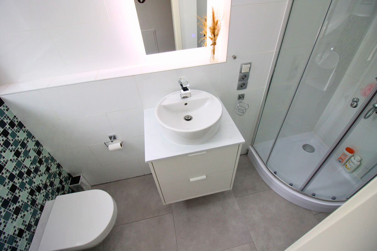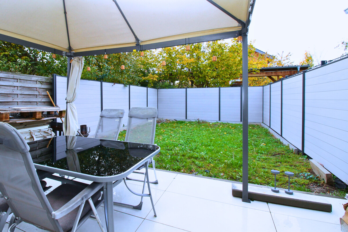 Im Erdgeschoss befindet sich zudem ein Gäste-WC mit Dusche, das durch seine moderne Gestaltung überzeugt. Der Zugang zum Garten erfolgt über den Wohnbereich und lädt mit einer Terrasse zum Entspannen ein.