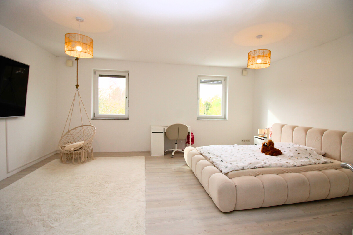 Im ersten Obergeschoss erwarten Sie zwei großzügige Schlafzimmer, die durch ihre Helligkeit und den hochwertigen Bodenbelag bestechen. Das Hauptbadezimmer ist ein echtes Highlight mit Badewanne und separater Dusche. Im Dachgeschoss befindet sich ein weiteres Schlafzimmer, das durch seine gemütliche Atmosphäre besticht.