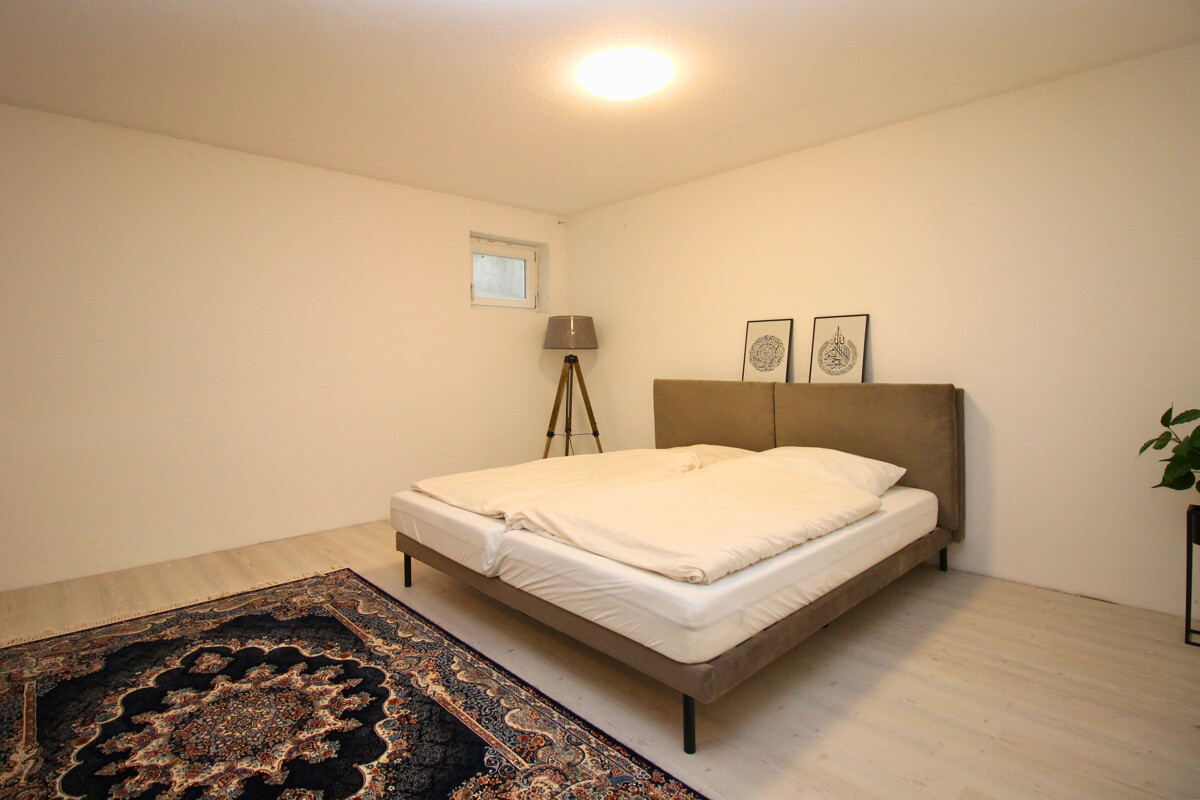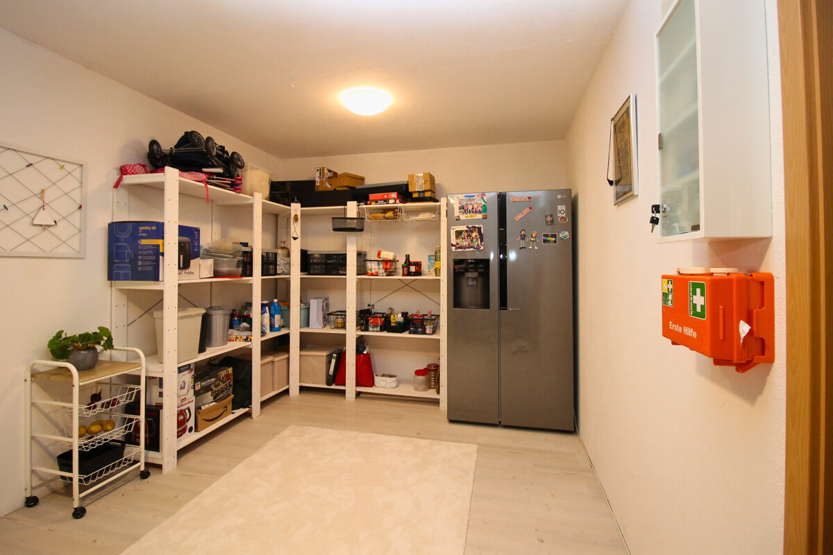 Der Keller bietet nicht nur praktischen Stauraum, sondern auch ein großzügiges zusätzliches Schlafzimmer, das dank der außergewöhnlich hohen Decken und der durchgängigen Fußbodenheizung vollwertigen Wohnkomfort bietet. Dieser Raum eignet sich ideal als Gästezimmer.