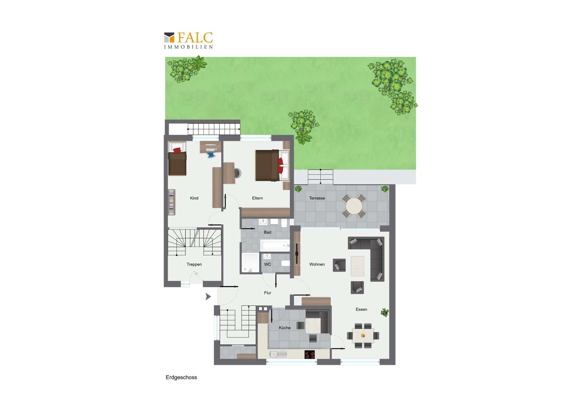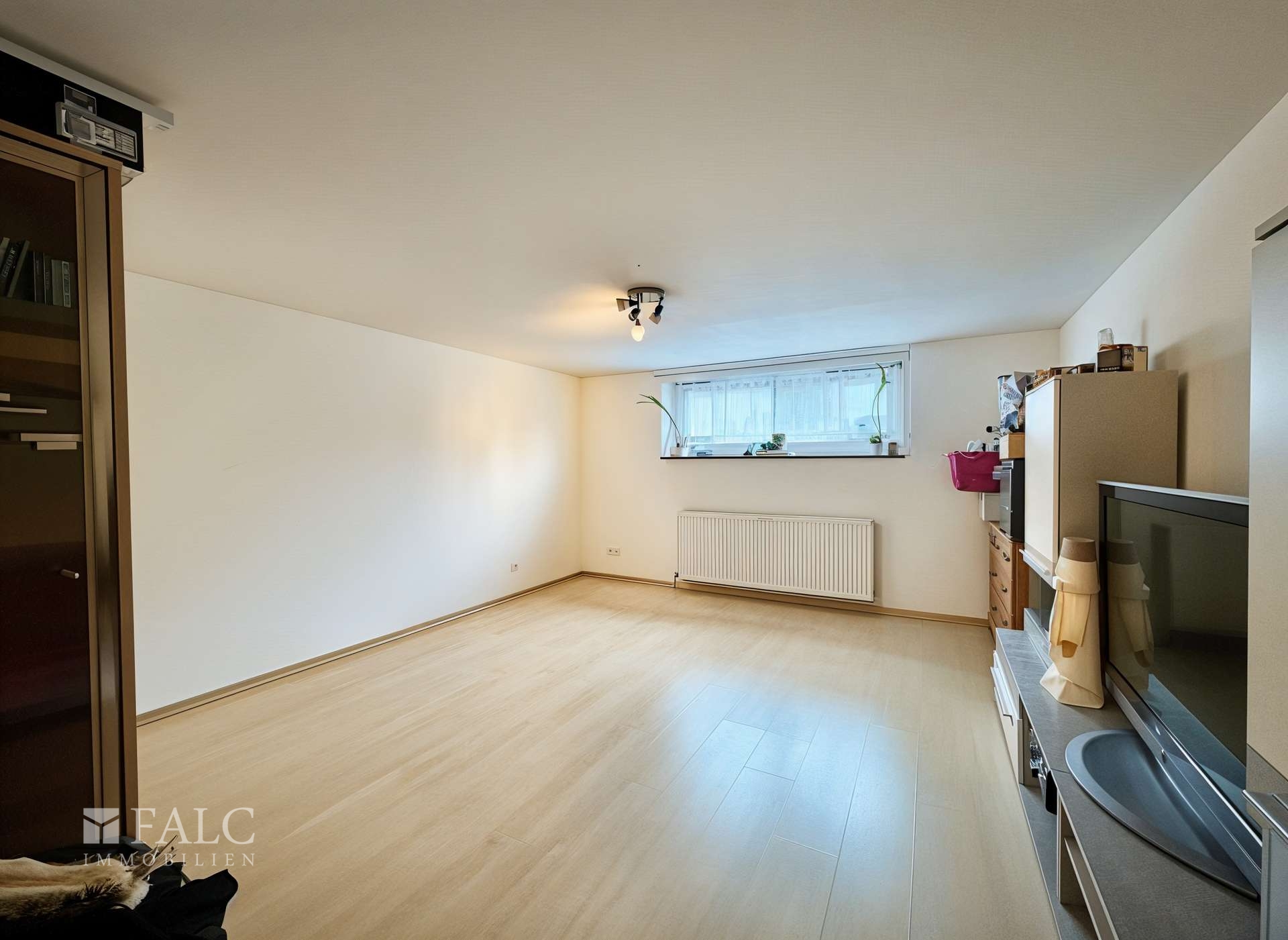 Die Erdgeschosswohnung, die seit 2020 vermietet ist und seit 2025 eine Kaltmiete von 855 € erzielt, erstreckt sich über das Erdgeschoss und Teile des Kellergeschosses. Sie umfasst vier Zimmer mit bis zu drei möglichen Schlafzimmern, ein Badezimmer mit Dusche, Badewanne und Fenster, ein Gäste-WC sowie einen großzügigen Terrassenbereich mit direktem Gartenzugang. Ergänzt wird diese Einheit durch eine separate Werkstatt und einen Partyraum im Kellergeschoss.
