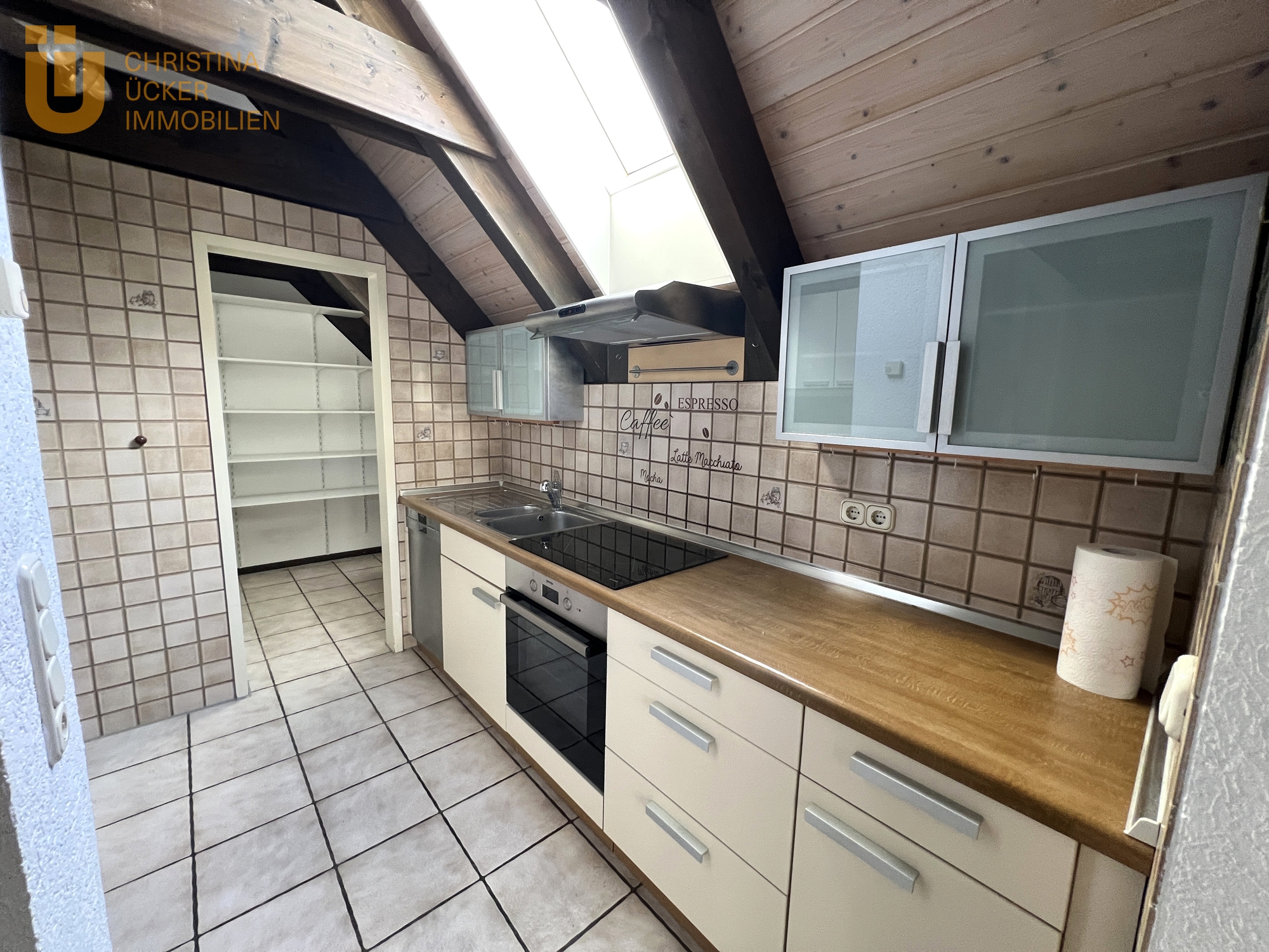 Links vom Eingang öffnet sich die Küche, die mit einer schlichten, zeitlosen Einbauküche ausgestattet ist. Eine Speisekammer mit Regalen bietet zusätzlichen Stauraum und sorgt für Ordnung.