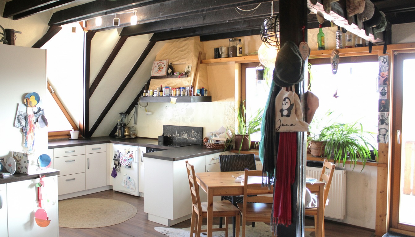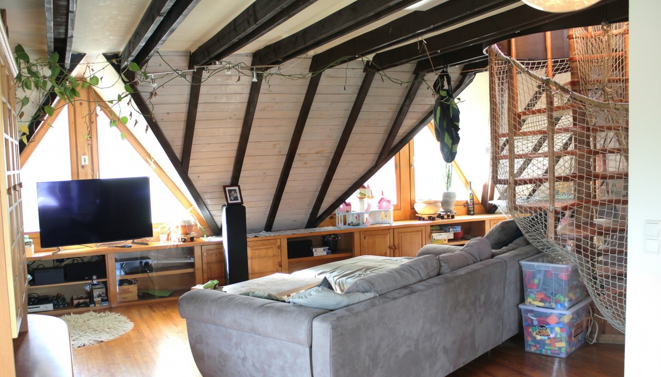 Die attraktive Maisonette liegt im 1. Obergeschoss und im Dachgeschoss eines Zweifamilienhauses am Waldrand des Ortes und bietet großzügiges und offenes Wohnen auf zwei Ebenen. Die offenen Balken und gemütliche Dachschrägen verleihen der Wohnung eine besonders gemütliche Atmosphäre. Großzügige Fensterflächen sorgen für helle und freundliche Räume und bieten einen attraktiven Ausblick ins Grüne. In der offenen Küche mit anschließendem Wohn- und Essbereich findet sich ausreichend Platz für einen großen Esstisch für die ganze Familie. Zusätzlich bietet das gemütliche Wohnzimmer Platz für eine gemütliche Sofalandschaft für entspannte Stunden mit Familie und Freunden. Auf dem großzügigen, überdachten Balkon lässt sich in der warmen Jahreszeit ein wunderbarer Ausblick über die Dächer von Stahringen auf die sanfte Hügellandschaft des Hegaus genießen. Im unteren Bereich befindet sich neben dem großen Badezimmer mit Wannenbad auch ein kleineres Arbeits- oder Kinderzimmer. Weitere Rückzugsmöglichkeiten befinden sich im oberen Geschoss der Wohnung, die durch eine Holzwendeltreppe erreicht werden können. Neben einem großen und hellem Dachstudio mit Echtholzparkett, bodentiefen Glasfenstern und eigenem Balkon befindet sich hier auch noch ein kleines Durchgangszimmer, ein schönes Erkerzimmer und ein weiteres Badezimmer mit WC und Dusche.