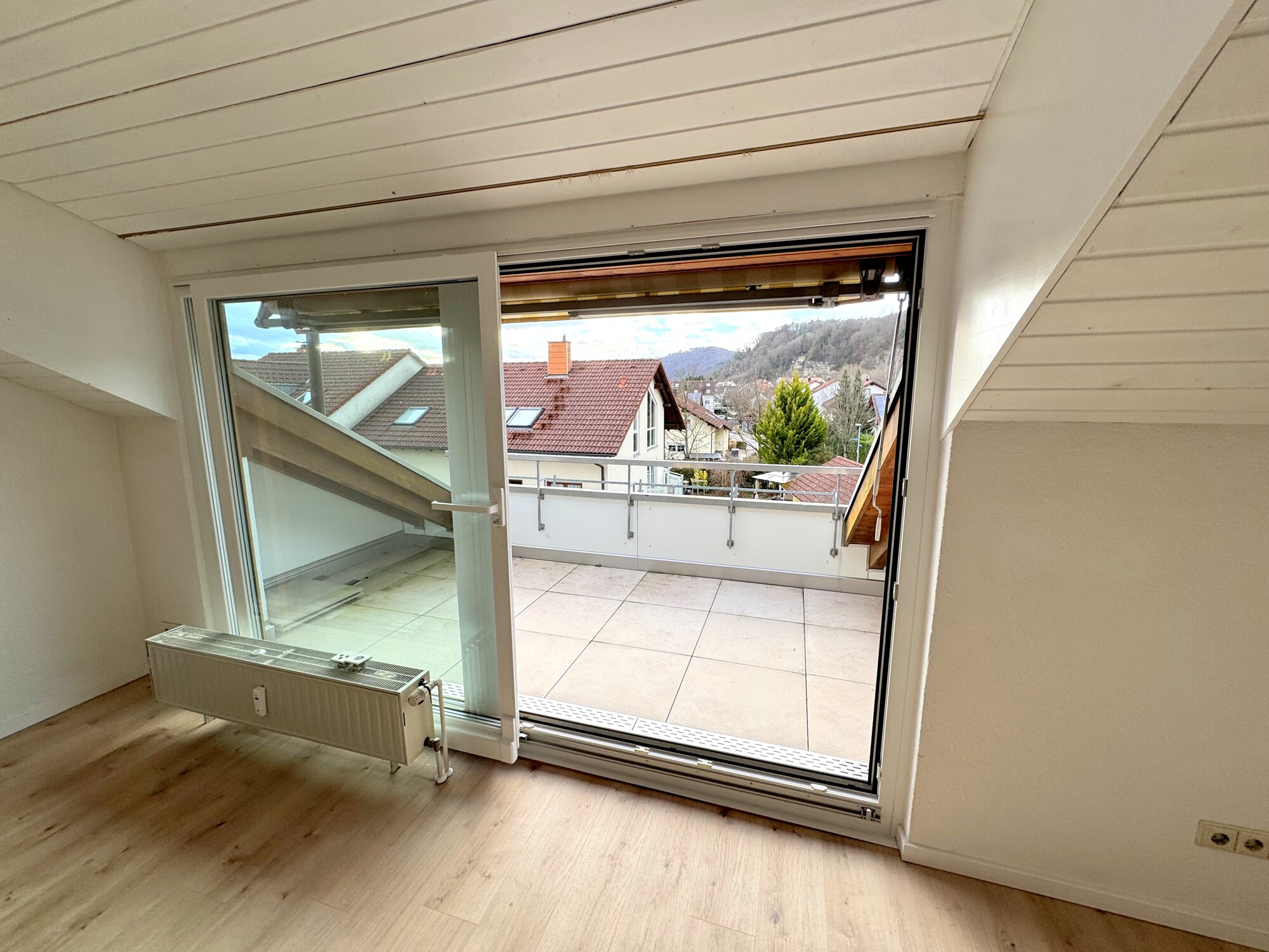 Herzstück ist der großzügige Wohnbereich mit großer Schiebetür zur Dachterrasse. Hier lässt sich der Tag entspannt beginnen oder ausklingen. Die Terrasse ist gefliest und bietet ausreichend Platz für Sitzmöbel. Durch die breite Glasfläche wirkt der Raum besonders hell.