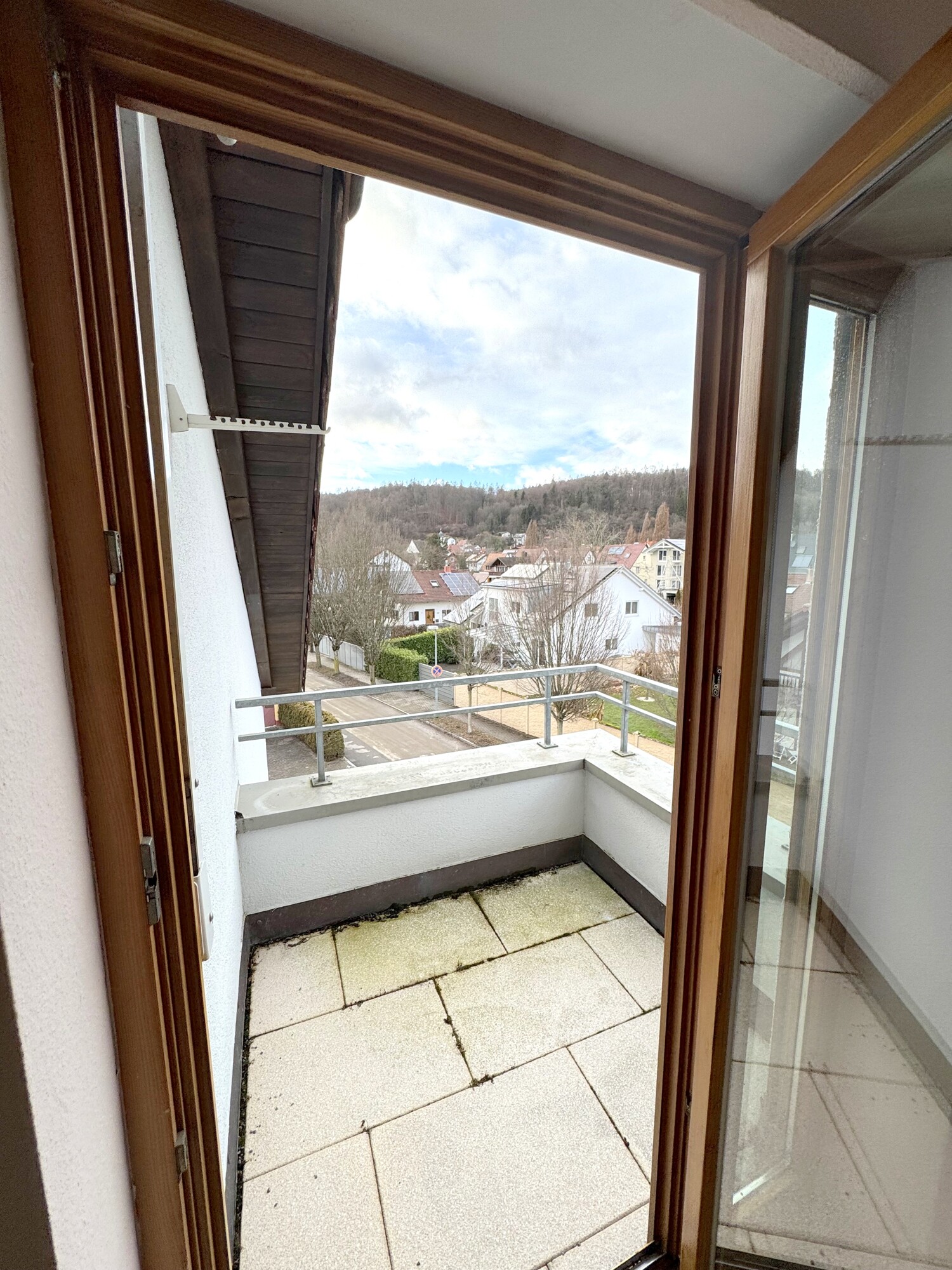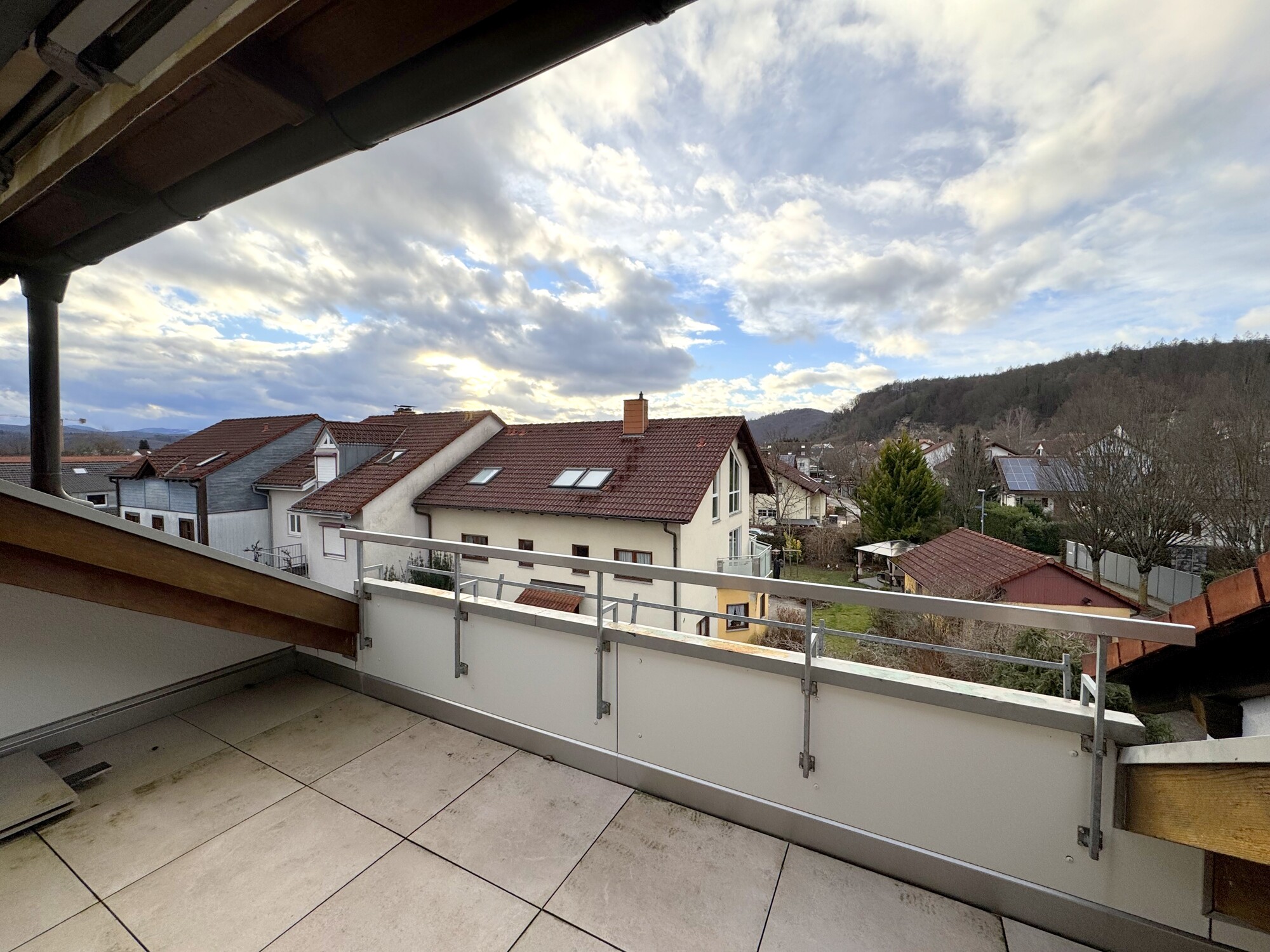 - Balkon mit großformatigen Bodenplatten und Metallgeländer