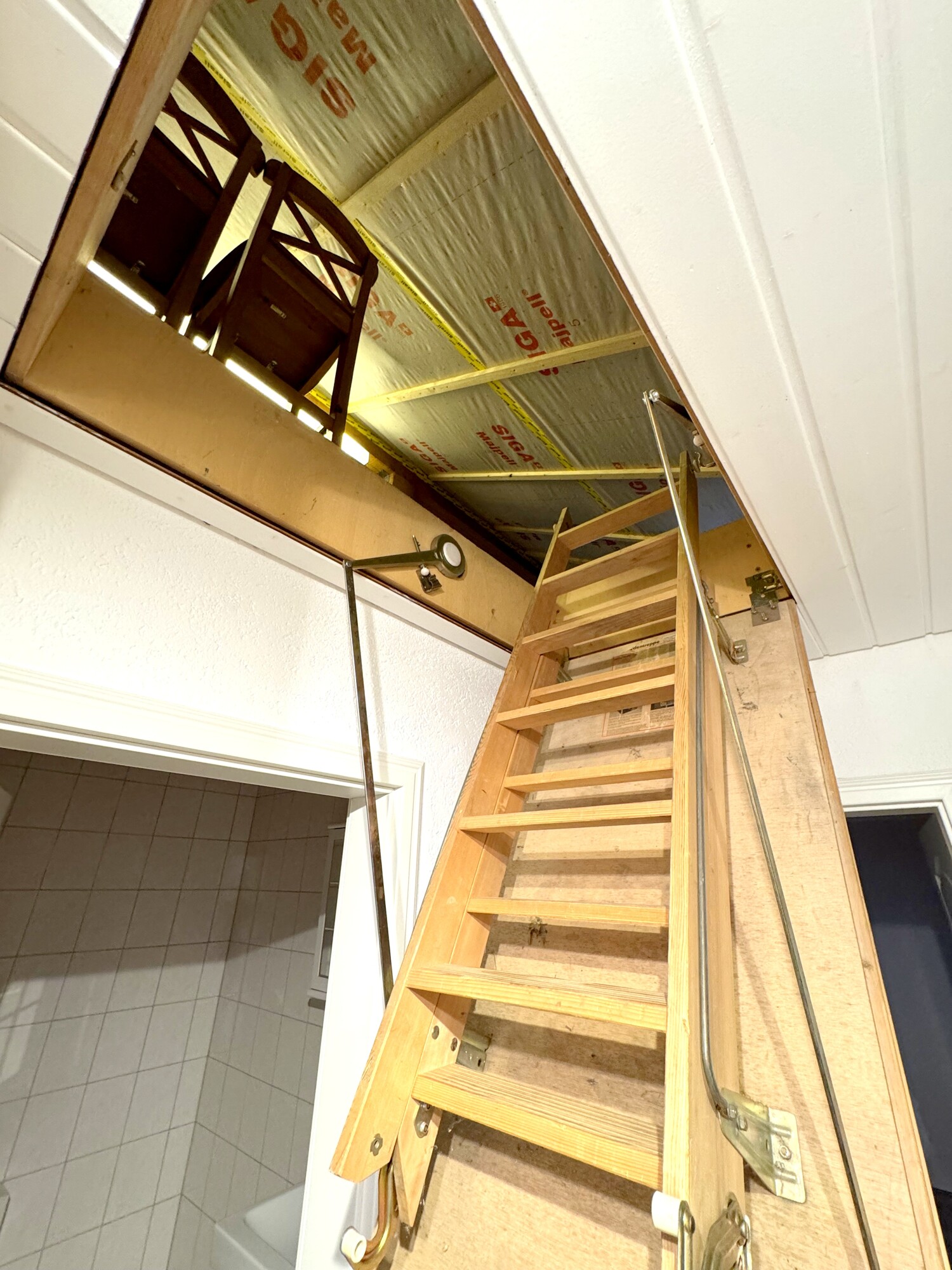Das Badezimmer ist kompakt angeordnet und ergänzt die Wohnung sinnvoll. Zusätzlicher Stauraum steht auf einer höher gelegenen Ebene zur Verfügung, wodurch die Wohnfläche effizient genutzt wird.