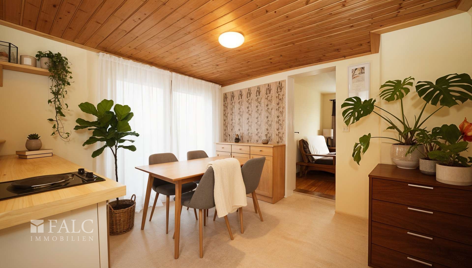 Damit es nicht bei Dosenravioli bleiben muss, ist das Geschoss mit einer Küche ausgestattet, sie bietet Platz für Vorräte und Kochutensilien, hier können Sie kulinarische Köstlichkeiten oder deftige Hausmannskost zaubern. Natürlich darf der Backofen genauso wenig fehlen wie ein Dunstabzug, der Dampf und unangenehme Gerüche filtert. Über den Flur angrenzend lädt ein lichtdurchflutetes Zimmer mit Zugang zur Terrasse als ideales Esszimmer ein, ideal für große Runden, gemeinsame Abende oder gemütliche Familienmahlzeiten. Durch die Ausrichtung der Terrasse nach Nordost können Sie zum Brunch bei Sonnenaufgang einladen.